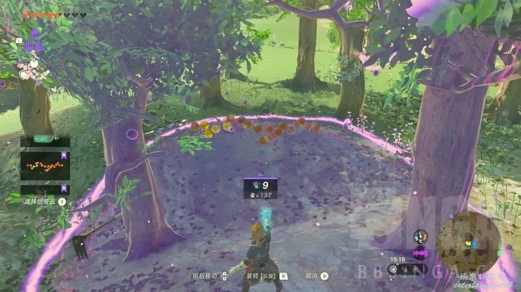 在蘋果樹林裡召喚出蘋果的藍圖,周圍的蘋果(包括樹上的)會自動被吸附到藍圖上。