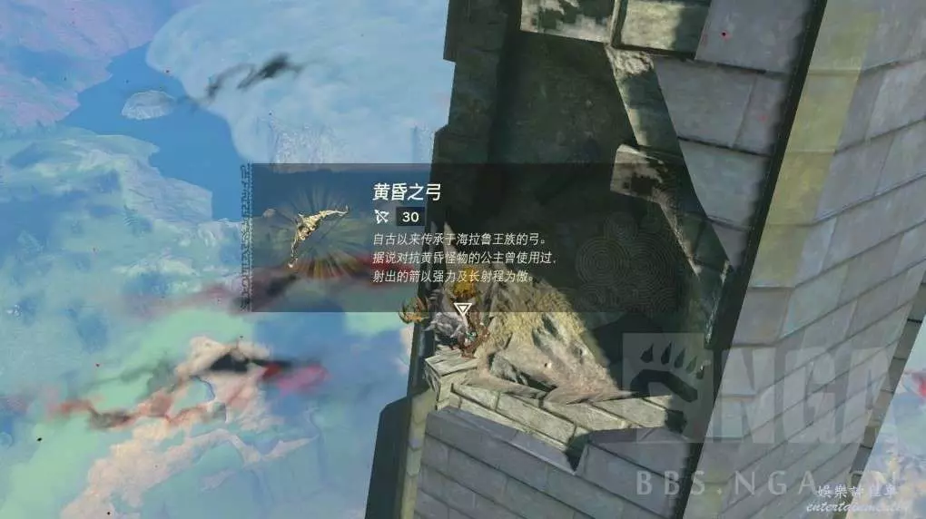 城堡最高處的塔頂上有一個缺口,這個缺口裡有一把黃昏之弓。可以直接從監視堡壘鳥望台飛過來。