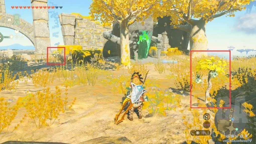 神廟傳送點旁邊就有6顆閃耀果。旁邊稍遠處還有額外9顆閃耀果。下圖葉子標記處為閃耀果。