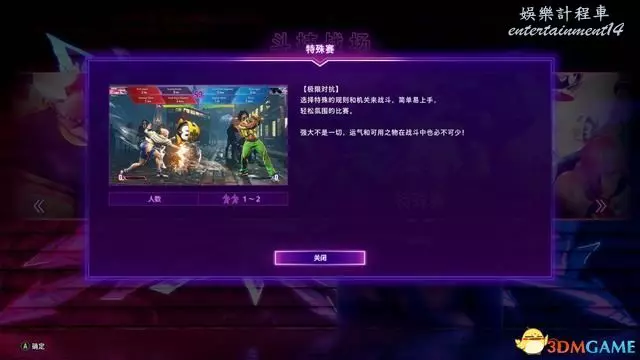 與傳統的“街霸”戰鬥不同,在“極限對抗”模式下可以選擇一些特殊的規則,或是加入機關進行輕鬆的娛樂對戰。