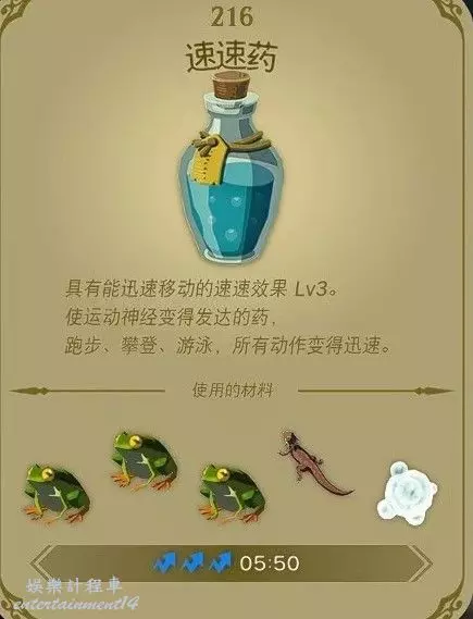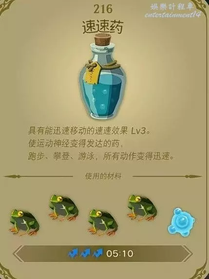 速速蛙3個+速速蜥蜴1個+丘丘膠1個=5分鐘的3級速度藥劑。