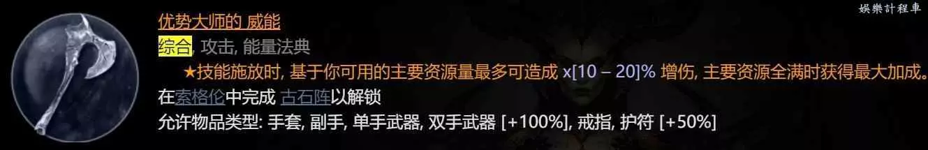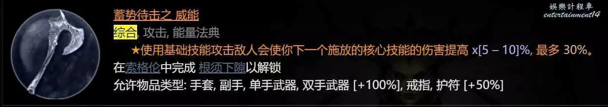 2、走劈斬傷害且不依賴攻速,雙手斧/劍/長柄均可拾取提升輸出,相對其他核心技能(先祖錘和雙手揮)有更良好的裝備反覆運算空間。