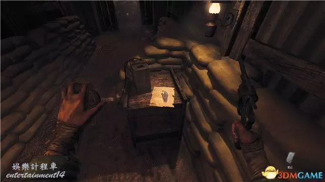 沿著戰壕的道路往前走,打開第一扇鐵門,進入一個房間。