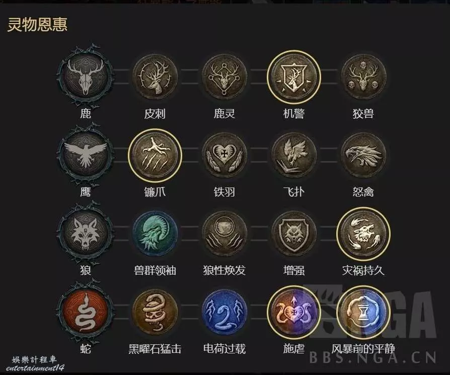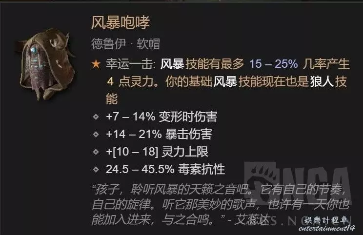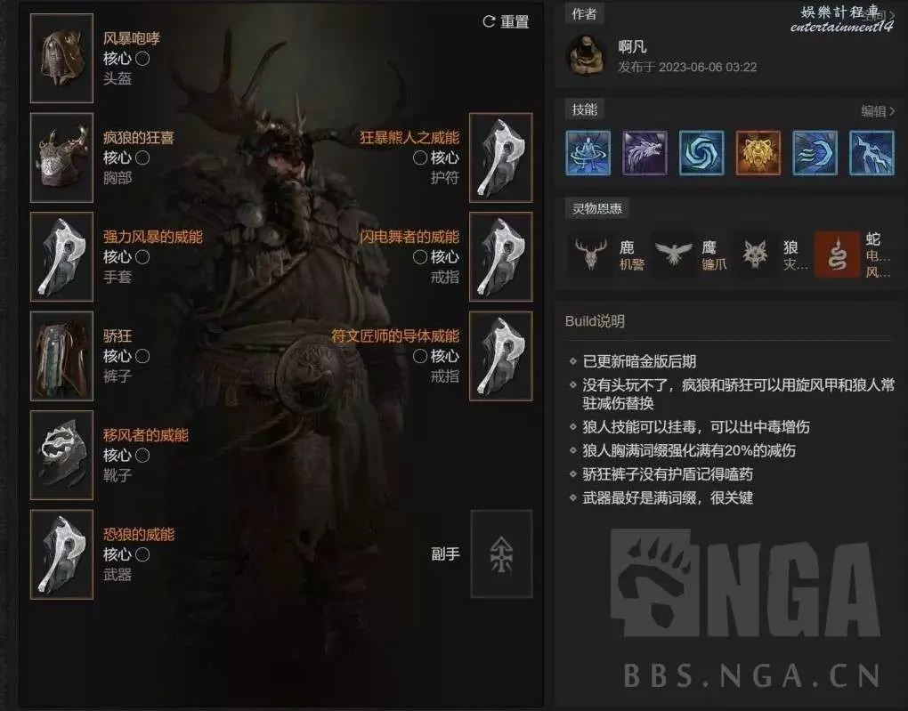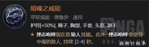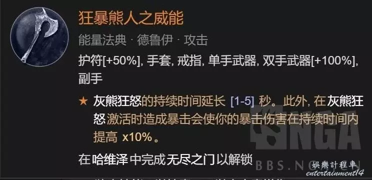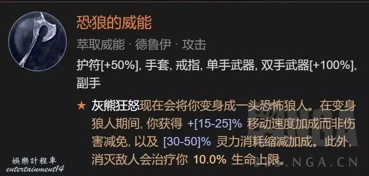 集回能回血爆傷增傷一體的我認為最強的變身威能,前期暴擊不夠的時候 恐狼的威能必須雙手武器(滿詞綴可以不耗能),狂暴熊人之威能必須項鍊(滿詞綴可以延長8秒變狼)