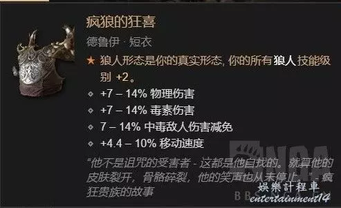 瘋狼的狂喜有中毒傷害減免,配狼人被動毒素之爪,滿詞綴可以提供20%的減傷,在割草層數可以提供巨額的減傷,還有3級技能強化(文字描述有錯誤,實測強化滿後會提供+3全狼人技能)