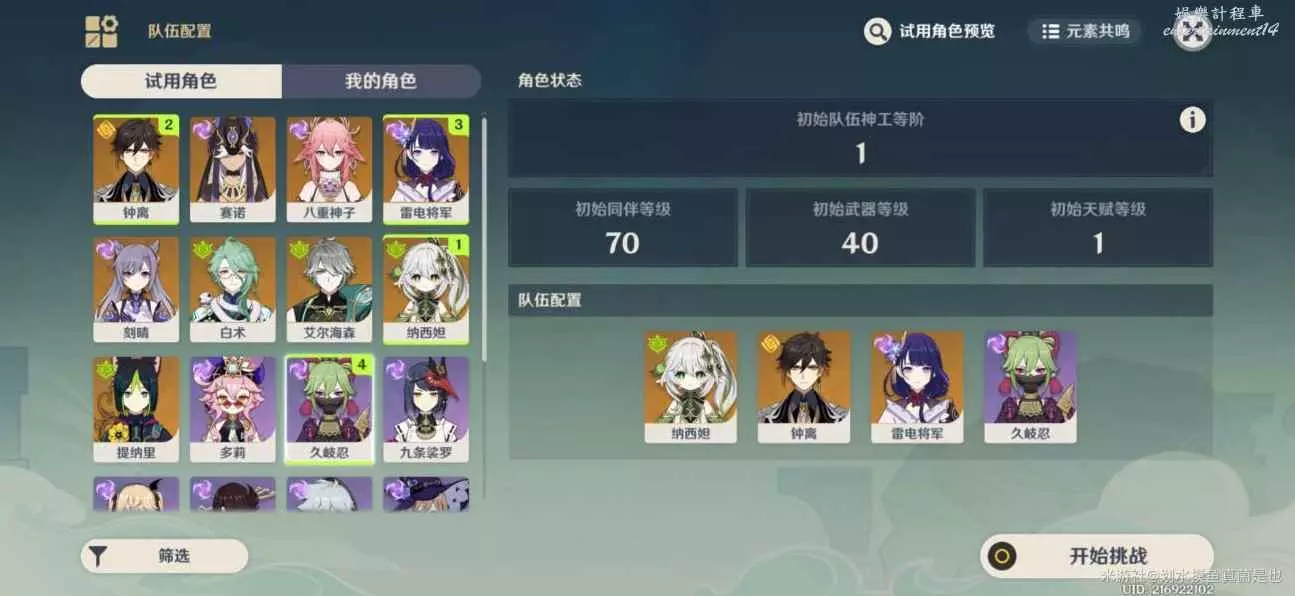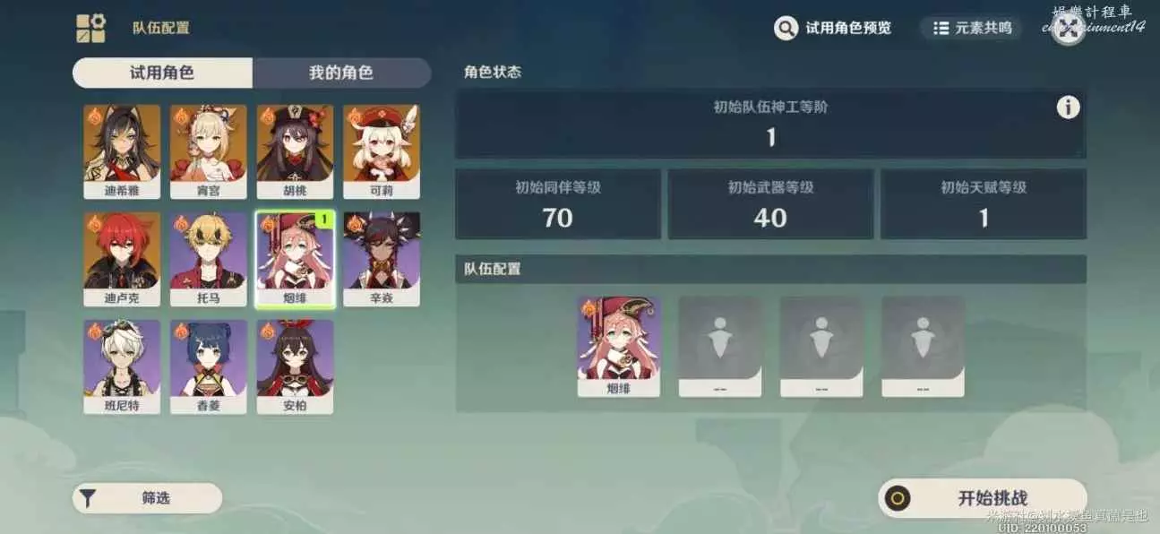 可莉放在一號位元,需要滿編隊吃到雙火的攻擊力加成,試用可莉武器流浪樂章,挑戰期間不要換人,只需可莉兩個重擊就可以打掉一波怪