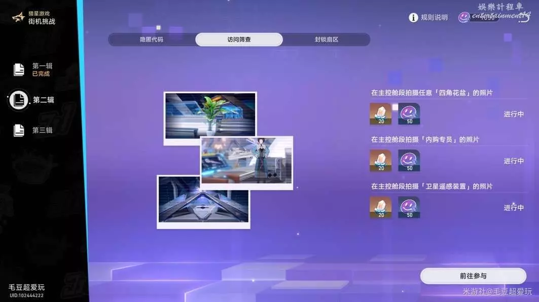 點「前往參與」可自動傳送到主控艙段,尋找人、物拍照的玩法,與塗鴉收集玩法類似。3張照片,每張照片20星瓊,獎勵共計60星瓊。