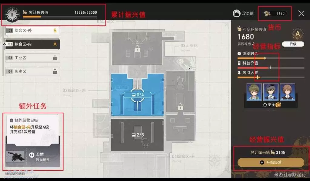 經營振興值:每次經營可獲得的振興值。每次可獲得數取決於經營指標,經營指標S時獲得最大振興值,最大振興值上限由展區等級決定。
