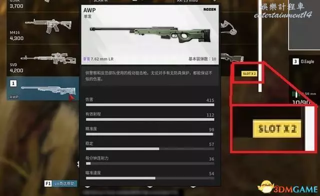 當然也有特殊情況,比如特別強大的兩把狙擊步槍就需要佔用兩個主武器槽位元(圖示右下角顯示“SLOT*2”)。