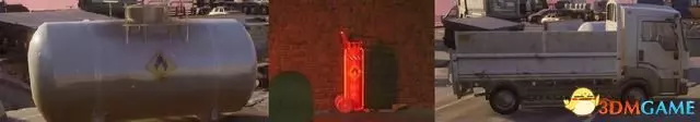 下圖則是一些基本的爆炸物(油箱、氣罐和車輛),根據大小不同,破壞它們需要的傷害也會有所不同。