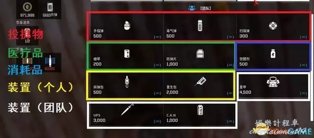 消耗品則分為“投擲物(2)”、“繃帶(2)”、“防彈裝甲(1)”、“覺醒劑(2)”和“裝置(1)”共五種。