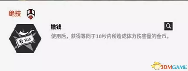 “撒錢”則是莉莉羅絲的主動技能,使用後的10秒內,根據造成的體力傷害獲得金錢。