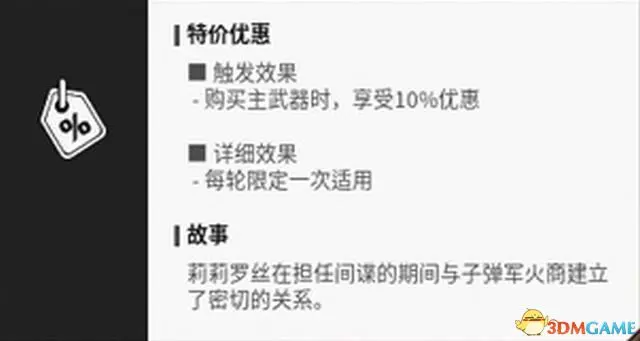 “特價優惠”則是每回合一次的商店10%優惠(僅限主武器),可以提前買到一些本該不夠錢買的武器。