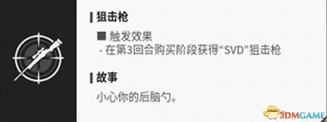 “狙擊槍”能在第三回合時(無關勝負)免費獲取價值4200金錢的狙擊槍“SVD”,在地勢開闊的地圖裡優勢非常明顯。