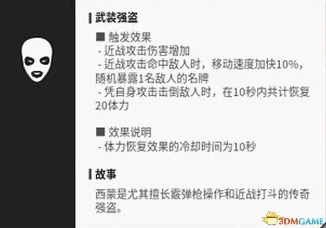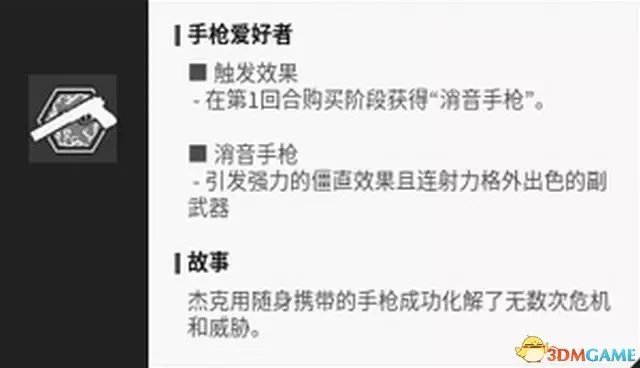 “手槍愛好者”可以在開局時無消耗獲得價值500金錢的消音手槍,還能在命中後敵人後使其控制力降低。