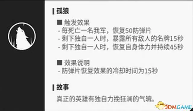 “孤狼”可以在友軍死亡後獲得防彈片,並且在己方僅剩自己時暴露敵方全隊位置,獲得各種增益效果。