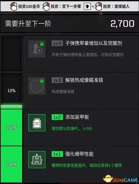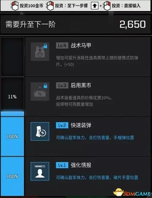 通過消費金幣進行投資,達到一定程度後即可解鎖特定的一些升級。