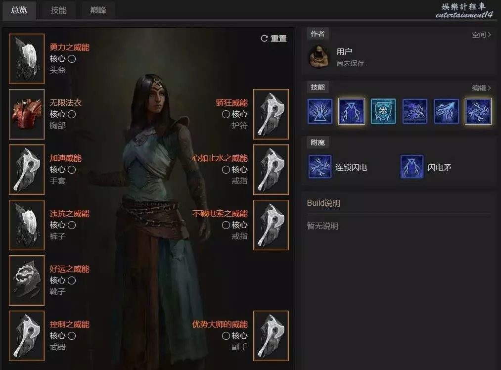 連鎖閃電(附魔);這個是我們單體輸出的核心技能,也是我們產出爆裂電花的重要來源,由於技能機制這個技能其實清怪效率並不高,這就是為什麼帶連鎖閃電的BD需要其他爆裂電花來配合清理小怪,更多的傷害才能打到精英怪上。
