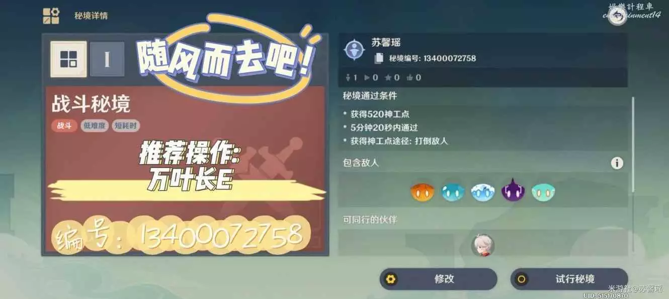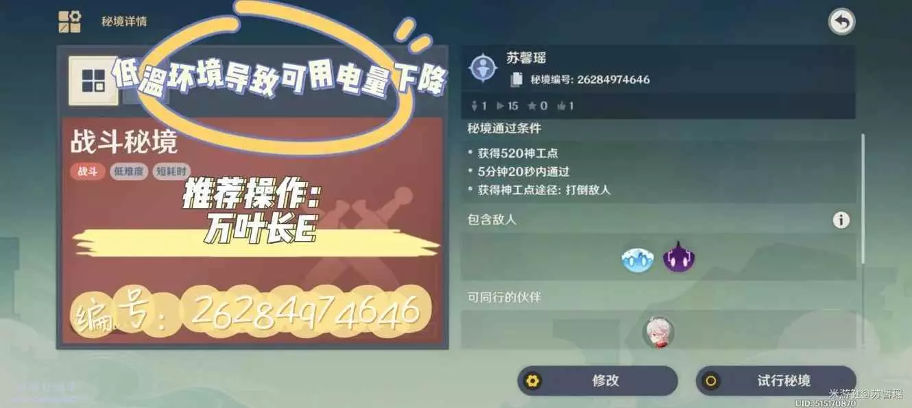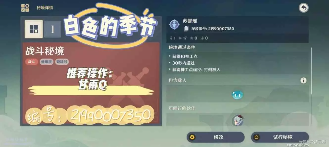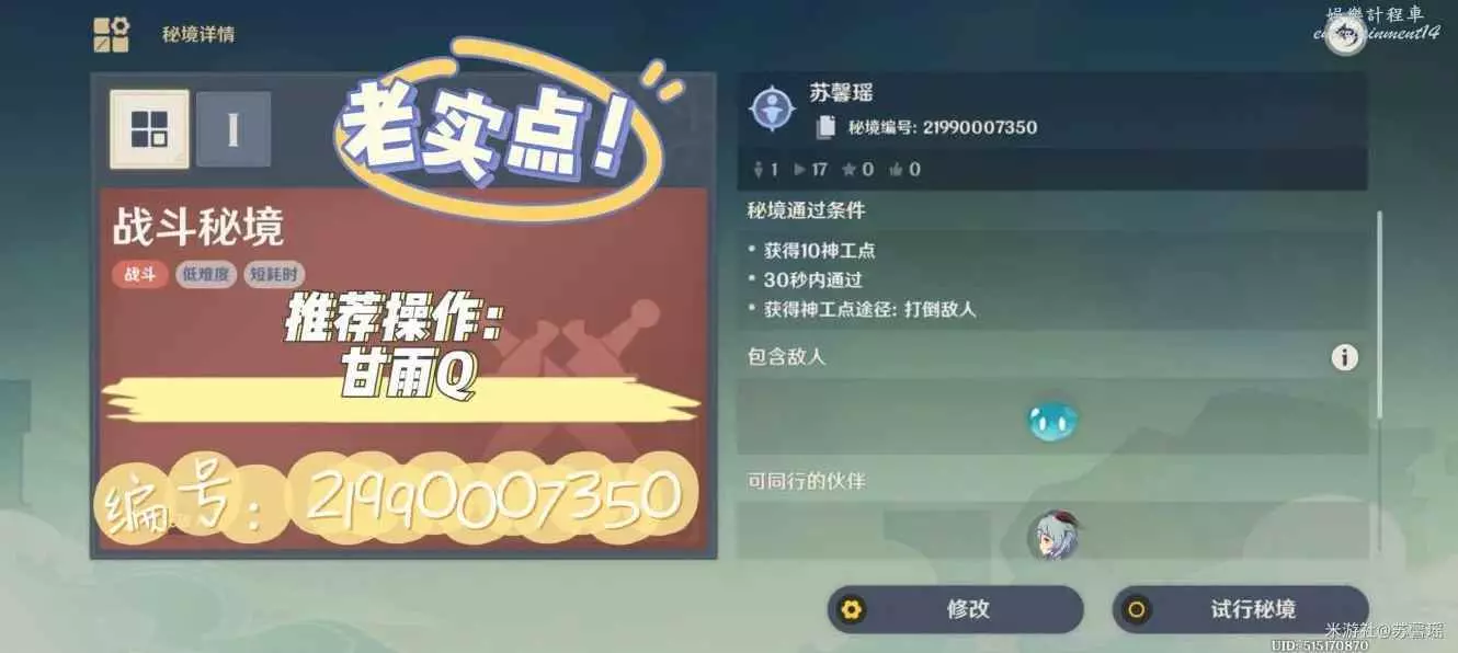 甘雨只需要一個元素爆發(Q)就可以,一步都不需要走,但由於Q需要CD以及充能,所以只給一波怪,打完一次選擇再次挑戰就行。