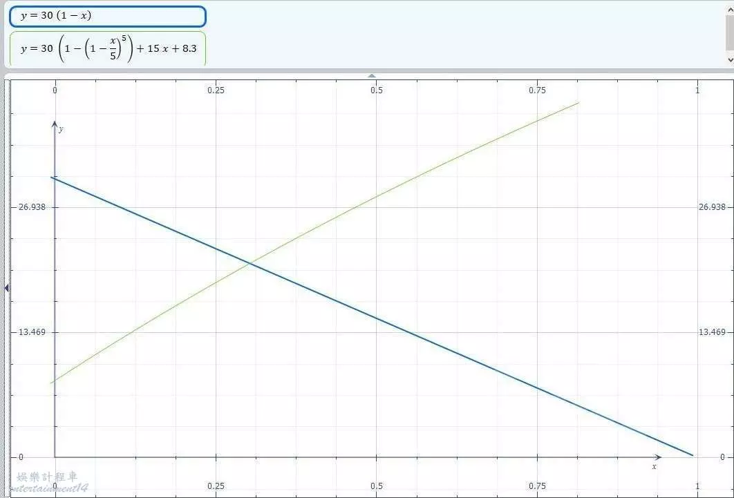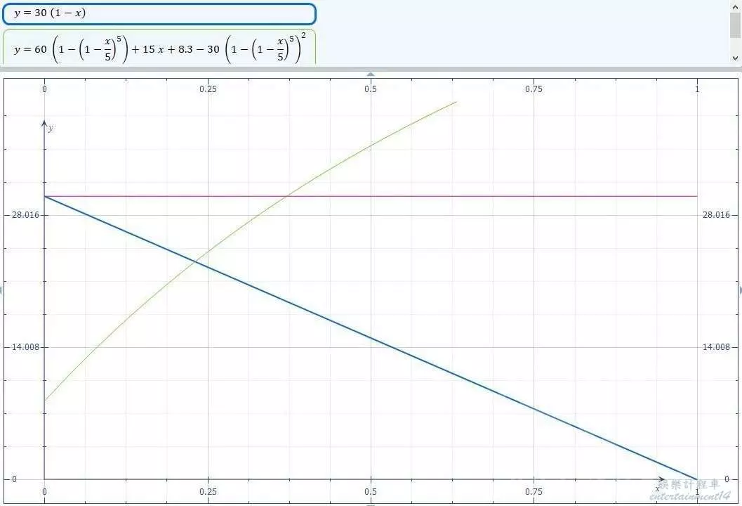 下圖中當藍色線(耗藍)取0時,參照值為紅色線。紅綠交點處約,55%(技能幸運)