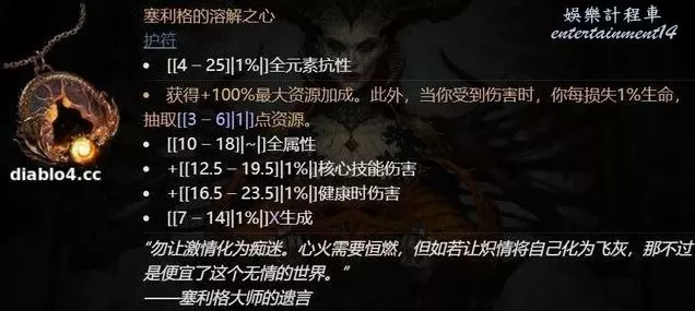 第一件是暗金項鍊塞利格的溶解之心,在玩家生命健康的時候,它可以為玩家提供20%左右的額外傷害,當玩家受到傷害的時候,它又能釋放儲存的100點能量值幫助玩家消滅惡魔。