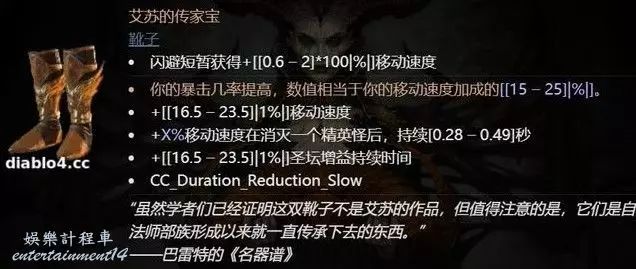 第二件裝備是艾蘇的傳家寶,這件鞋子有一個非常有趣的聯動設計,玩家閃避攻擊後可以獲得額外的移動速度,它本身也提供20%左右的移動速度,而且玩家消滅精英怪物後也可以提供一定速度,這三重的移動速度提升都可以提升玩家的暴擊值,真是邊跑邊打,快樂無窮。