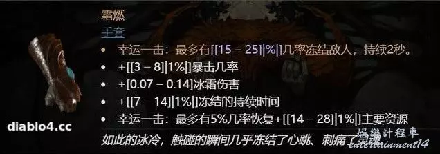 第三件裝備是非常經典的老裝備“霜燃”手套,它只帶20%左右的凍結幾率,而且還能提升10%左右的凍結時間。