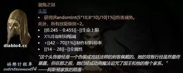 第四件裝備就是大名鼎鼎的“諧角之冠”,也就是暗黑2裡面的綠色軍帽,它最大的特色也保留到了暗黑4,同樣提供所有技能+2。
