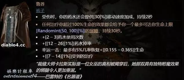 第五件是一條超級肉的褲子“魯莽”,他全面提升了藥水效果,首先是藥水數量+3,然後是藥水掉率加20%,藥水還能提供移動速度和額外的屏障,可以說這件褲子把藥水流玩到了極致。
