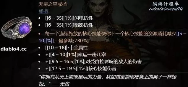 電系和暗影系BUILD推薦無星之空戒指,它的增傷相比聖母戒弱一些,但是特效的回能更加穩定,只要玩家的節奏好,每個核心技能都能穩定減少30%消耗,非常實用。