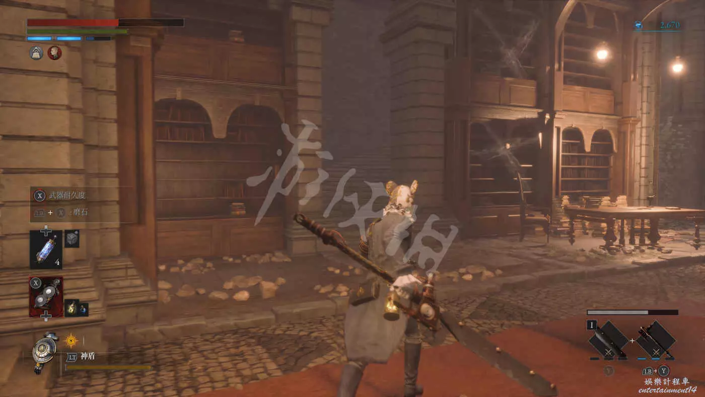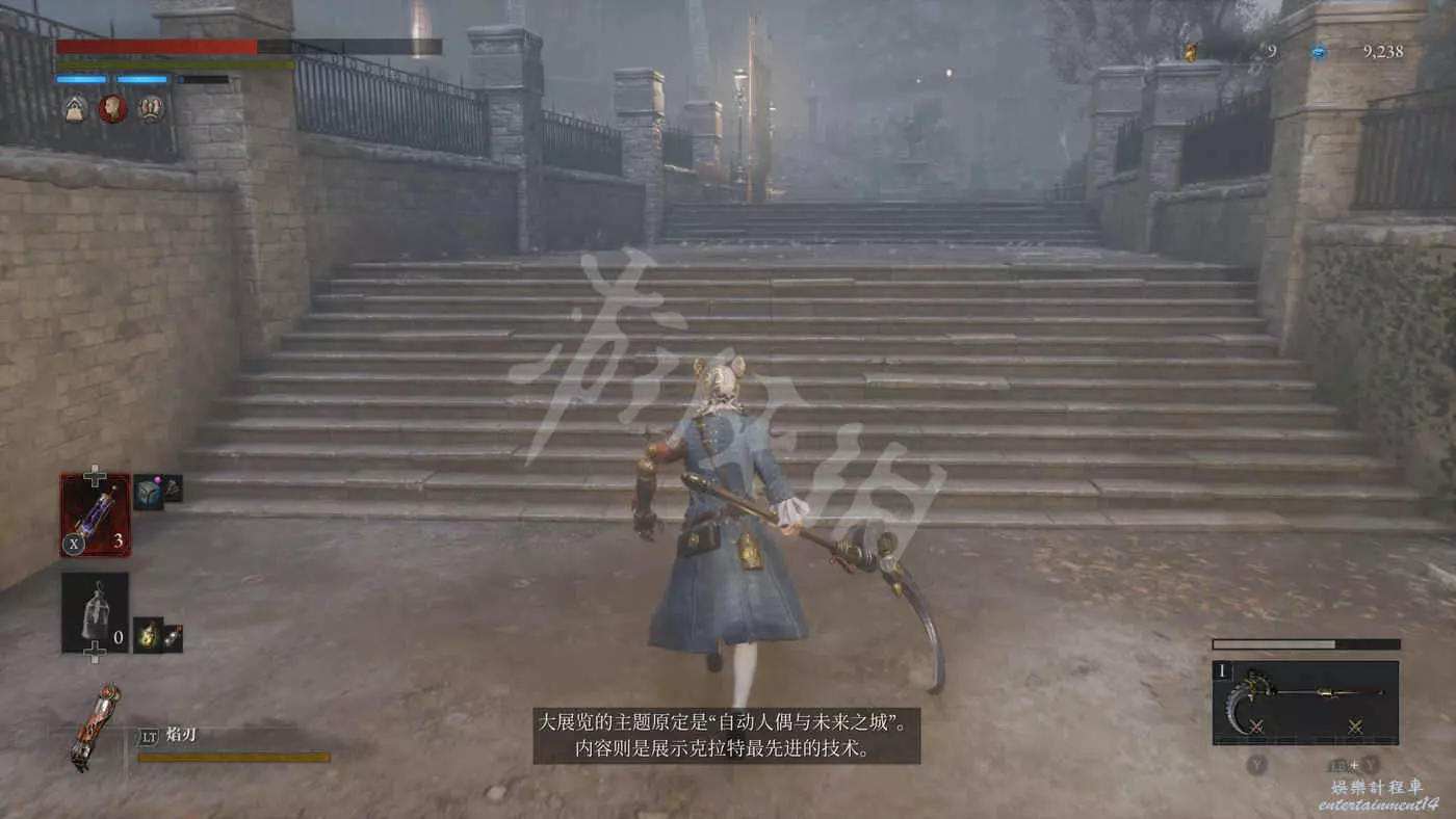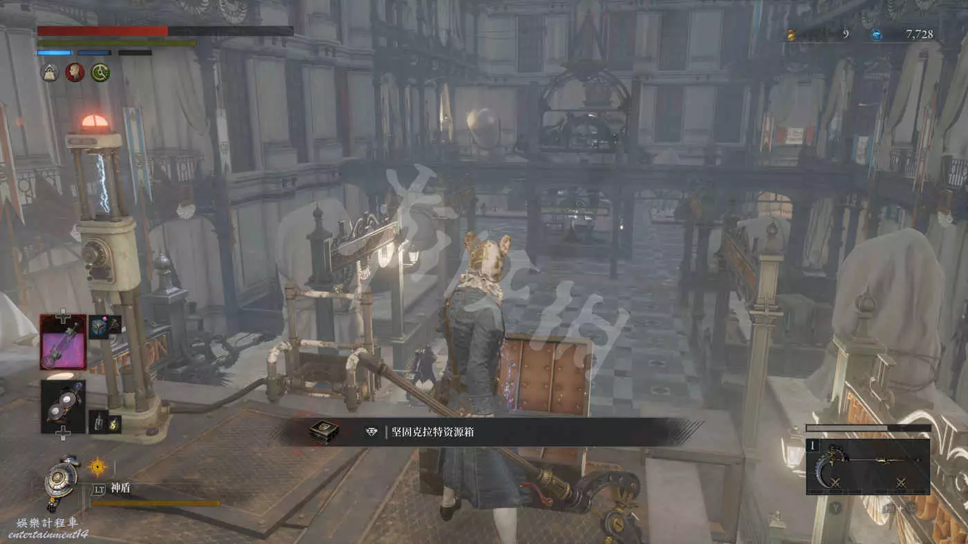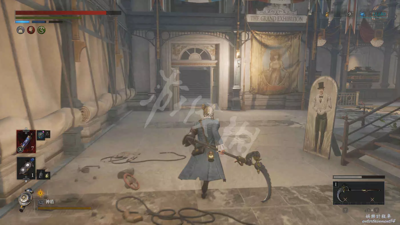 在樓下的小花園有個守衛,擊敗後獲得裝備【力量護身符】,還有個大寶箱,打開後拿到【石英】,另外還有個通往博覽會展廳入口的捷徑。