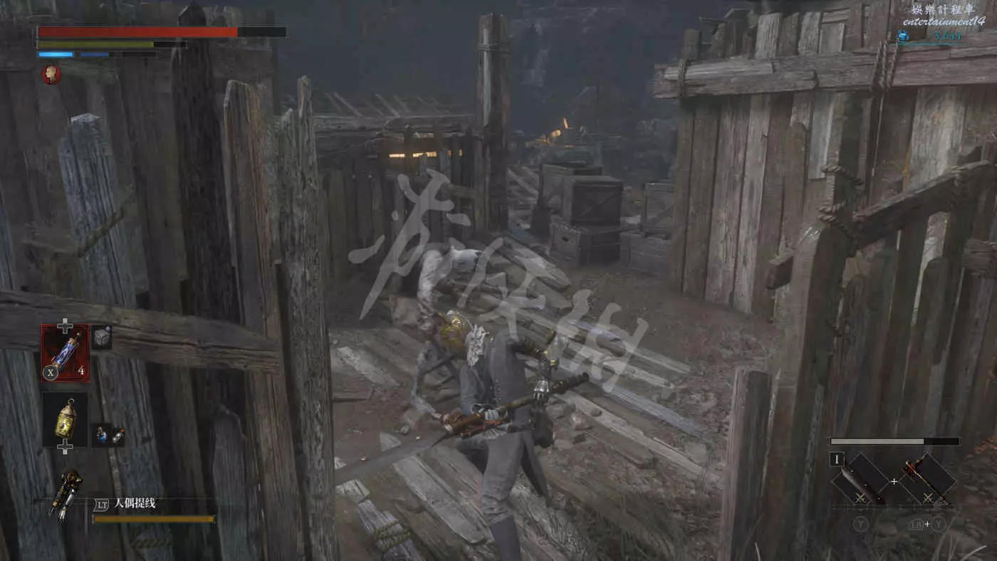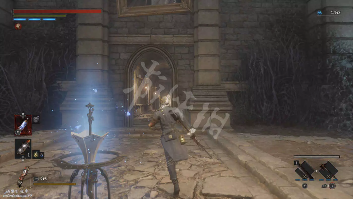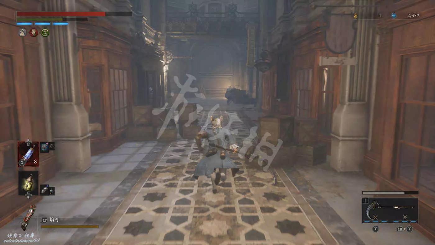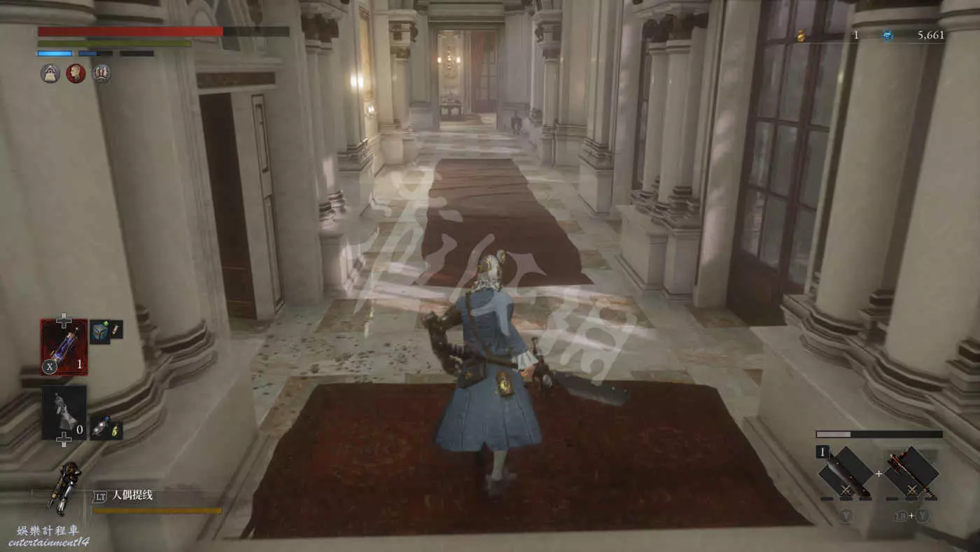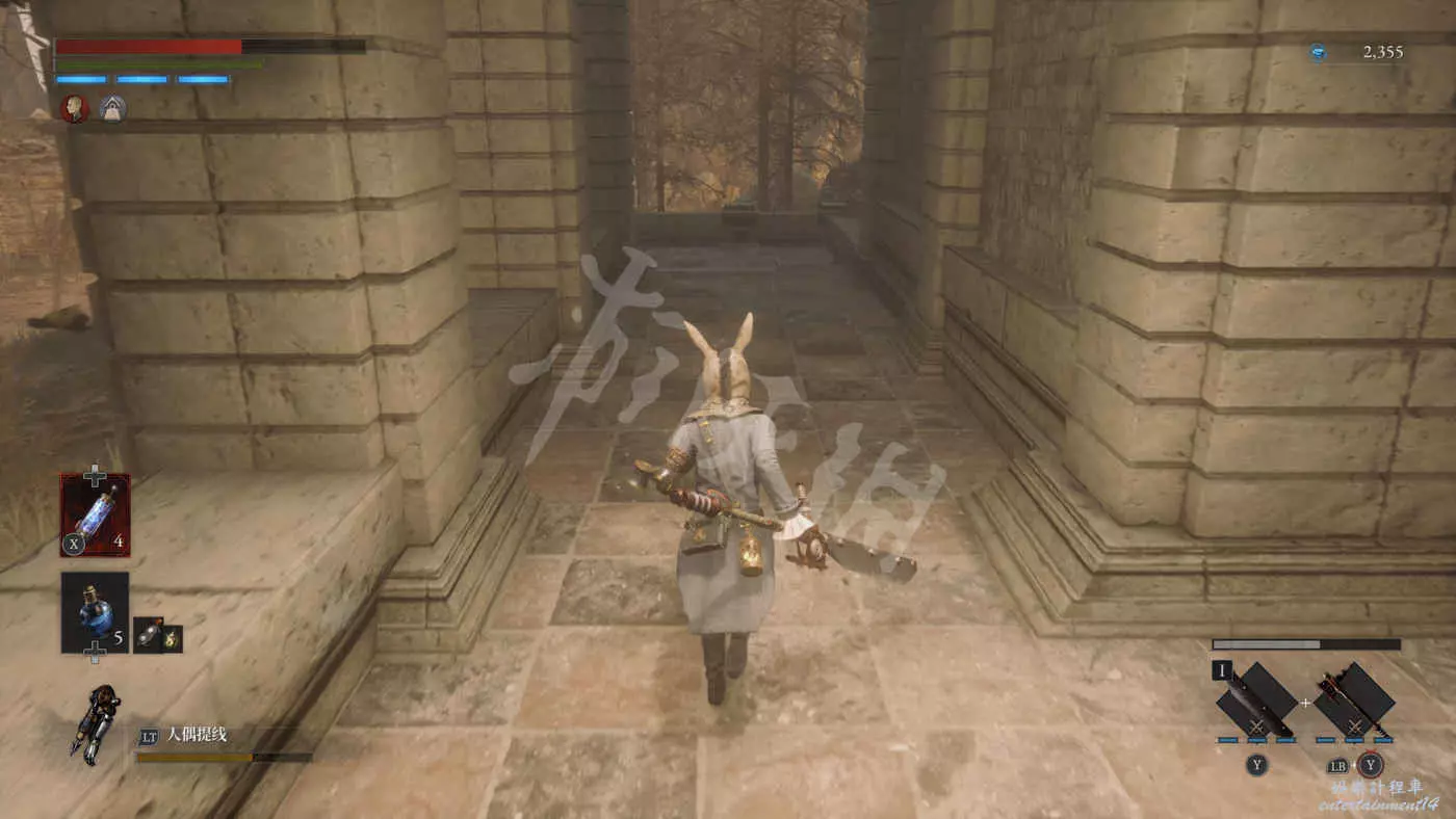 往右走來到一棟建築外,在灌木叢附近會有一個手持電棍的皇家守衛人偶在巡邏。皇家守衛的人偶都是快慢刀且傷害很高,完美防禦可以折斷他們的武器,削減了部分戰力但是他們的招式會有所變化。