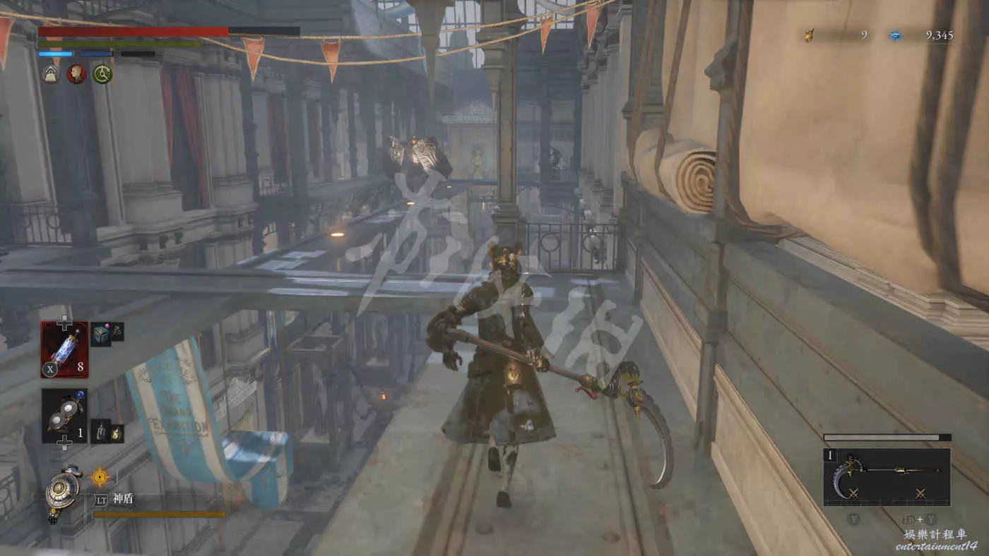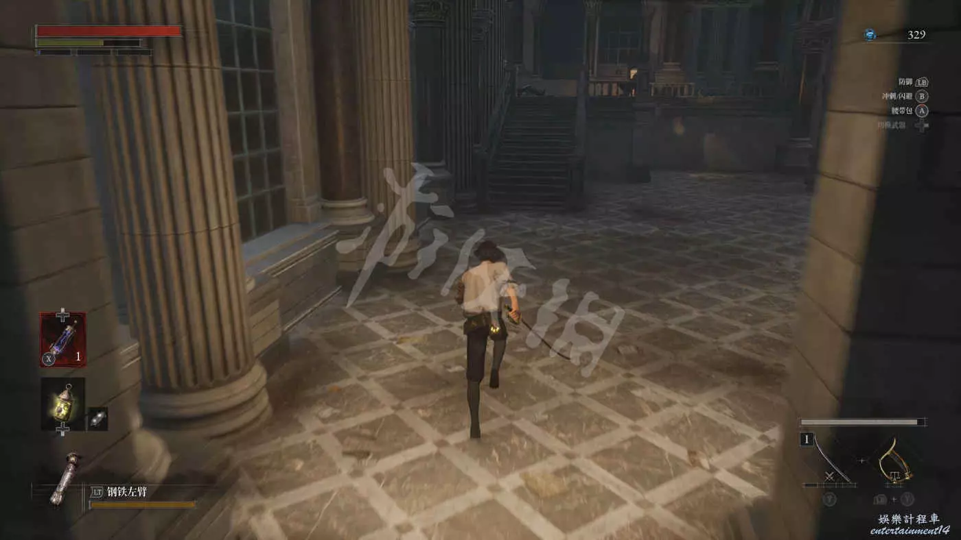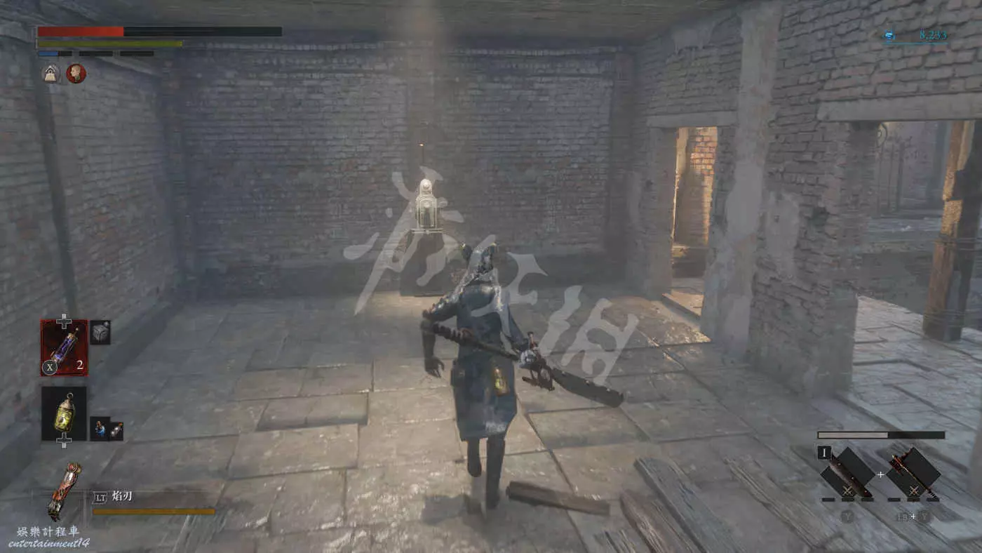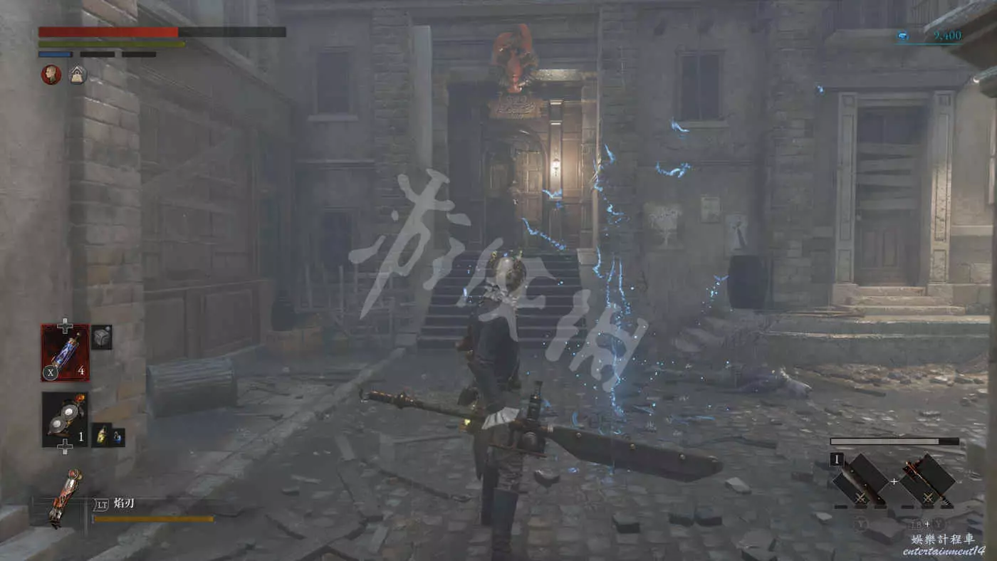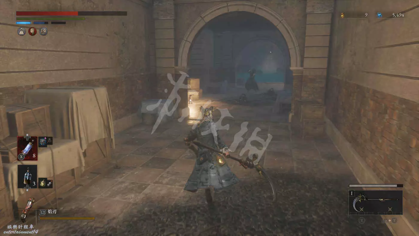 往右走來到一棟建築外,在灌木叢附近會有一個手持電棍的皇家守衛人偶在巡邏。皇家守衛的人偶都是快慢刀且傷害很高,完美防禦可以折斷他們的武器,削減了部分戰力但是他們的招式會有所變化。