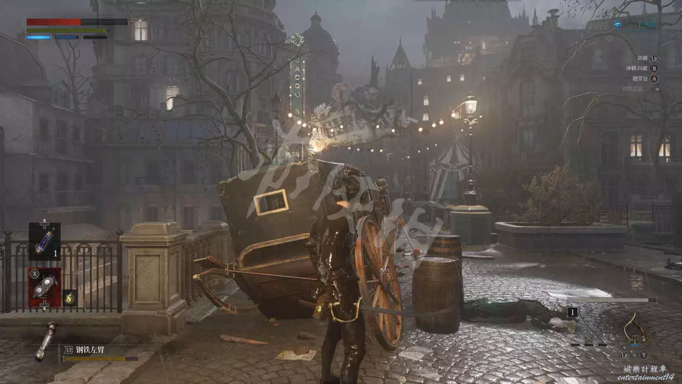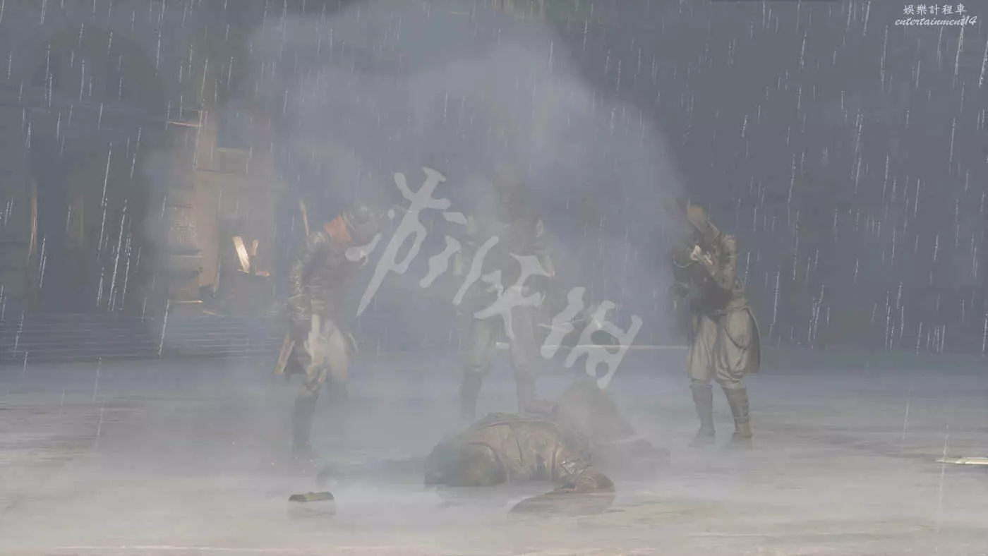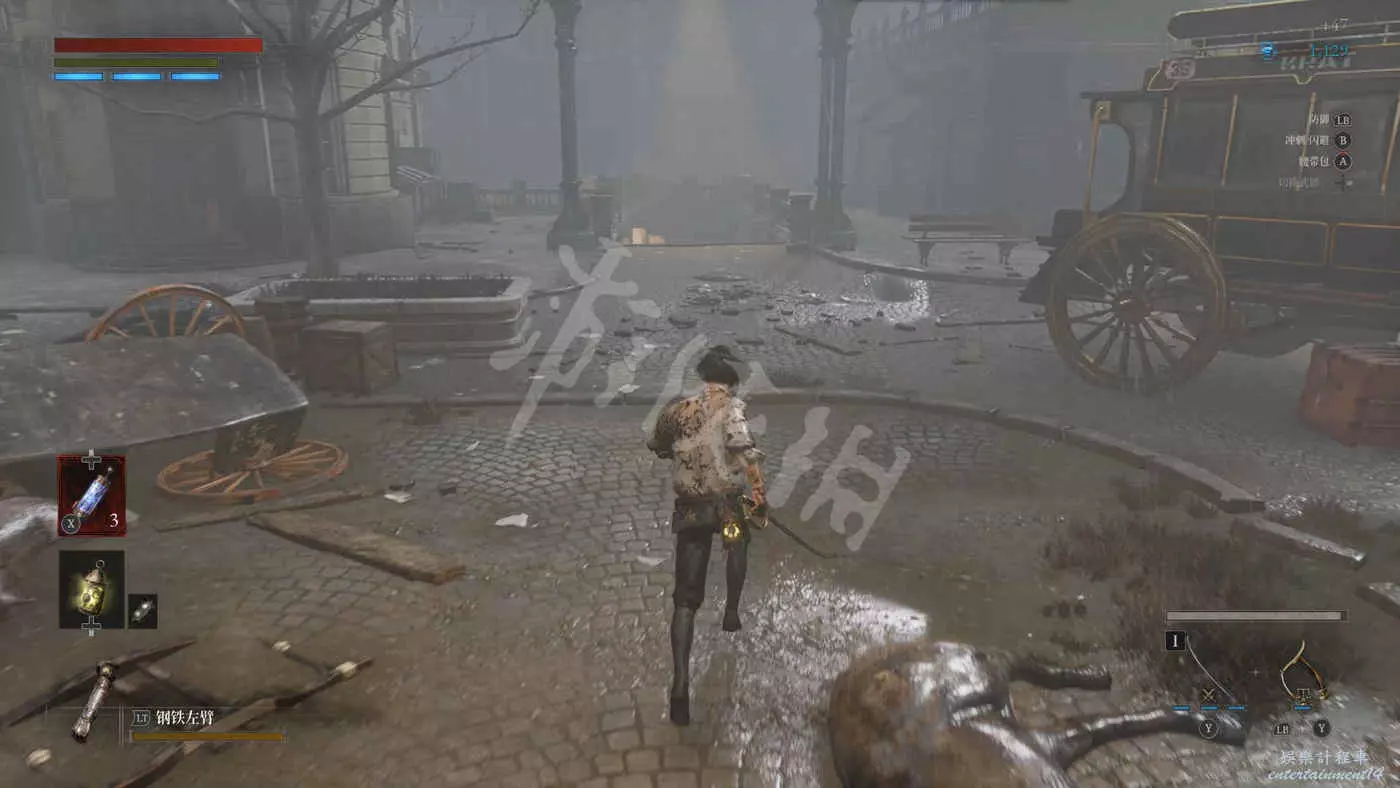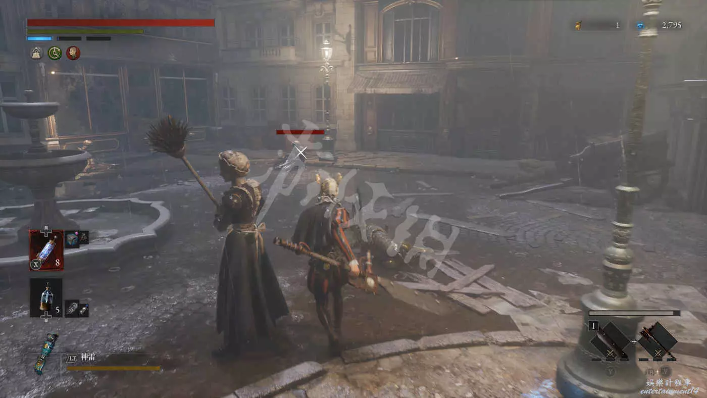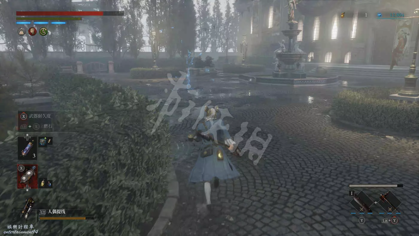 往右走來到一棟建築外,在灌木叢附近會有一個手持電棍的皇家守衛人偶在巡邏。皇家守衛的人偶都是快慢刀且傷害很高,完美防禦可以折斷他們的武器,削減了部分戰力但是他們的招式會有所變化。