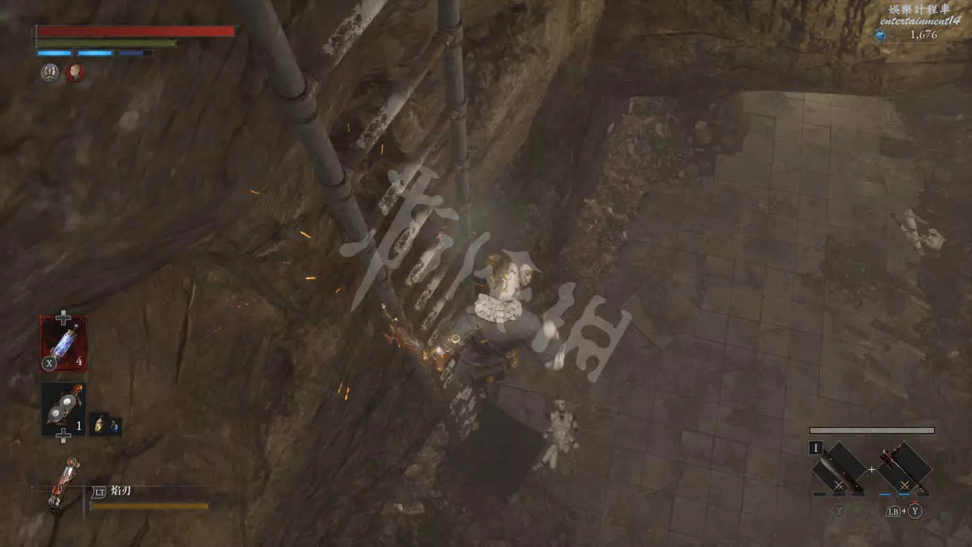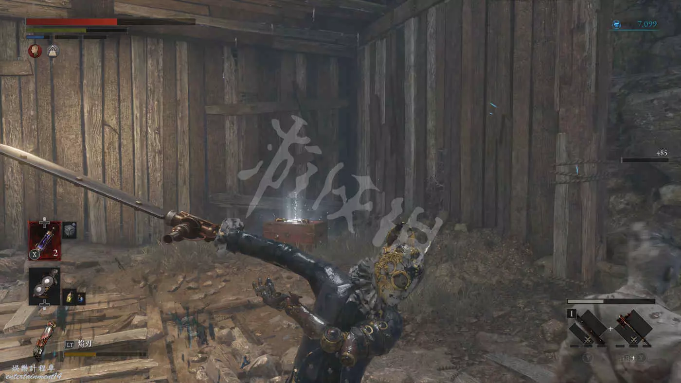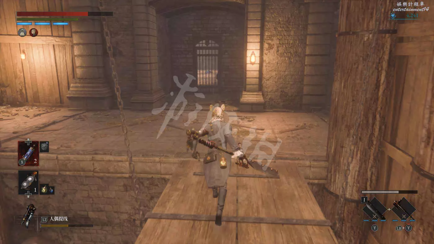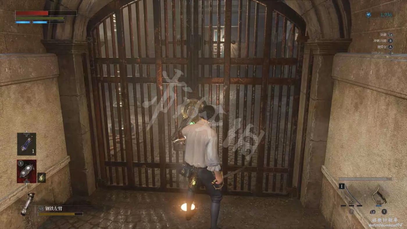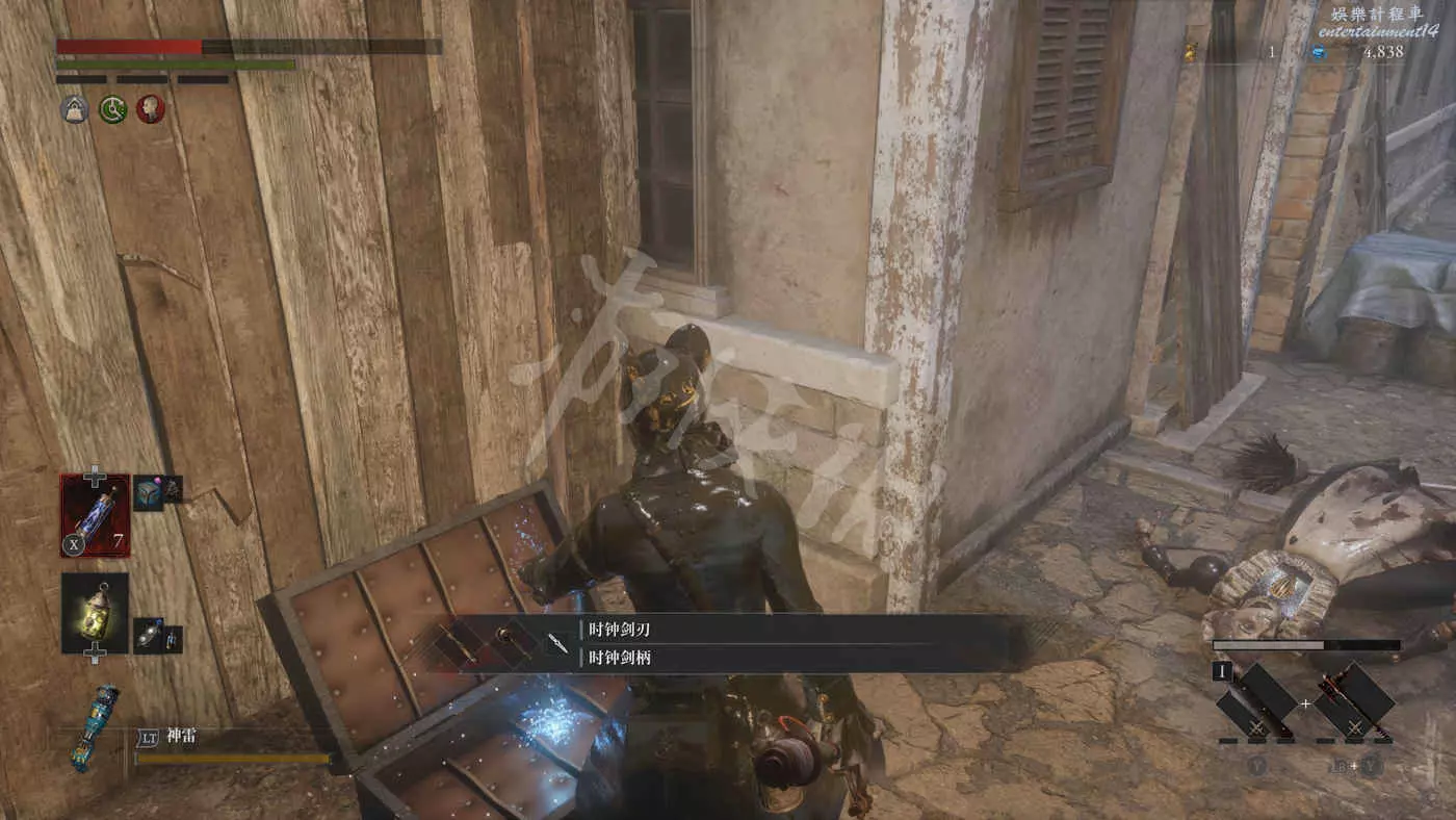路上來到一個拱門處可以找到一個往上爬的梯子,爬上去之後在盡頭可以看到一個大寶箱,打開後拿到武器【時鐘劍】。