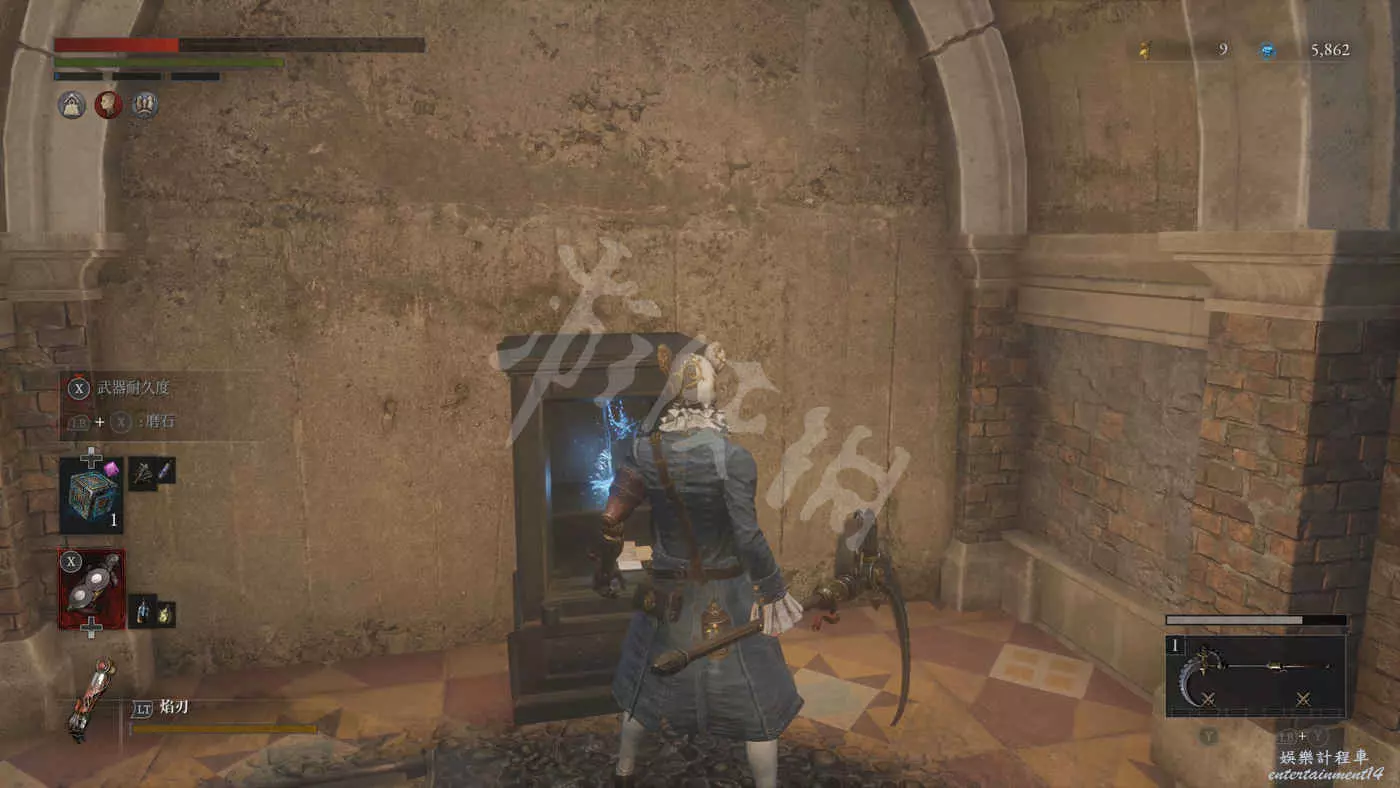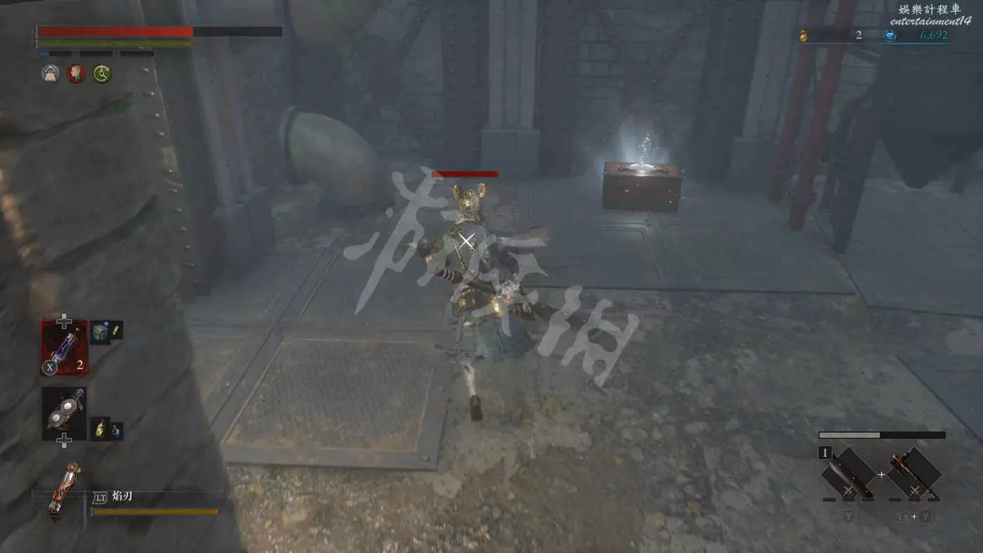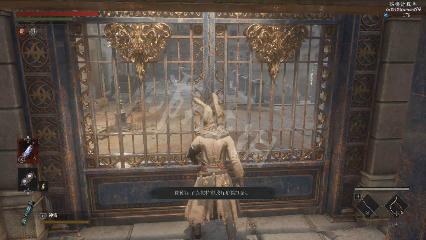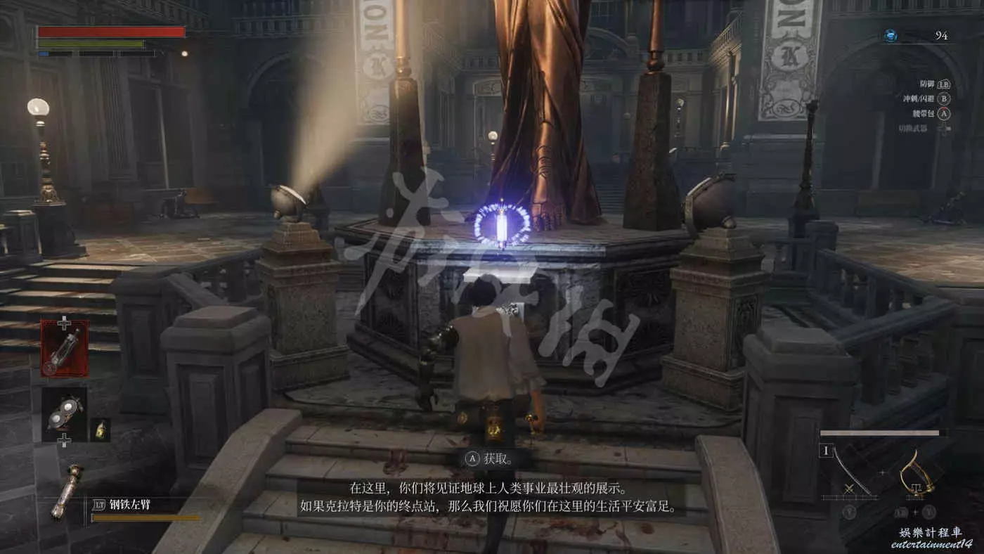 路上來到一個拱門處可以找到一個往上爬的梯子,爬上去之後在盡頭可以看到一個大寶箱,打開後拿到武器【時鐘劍】。