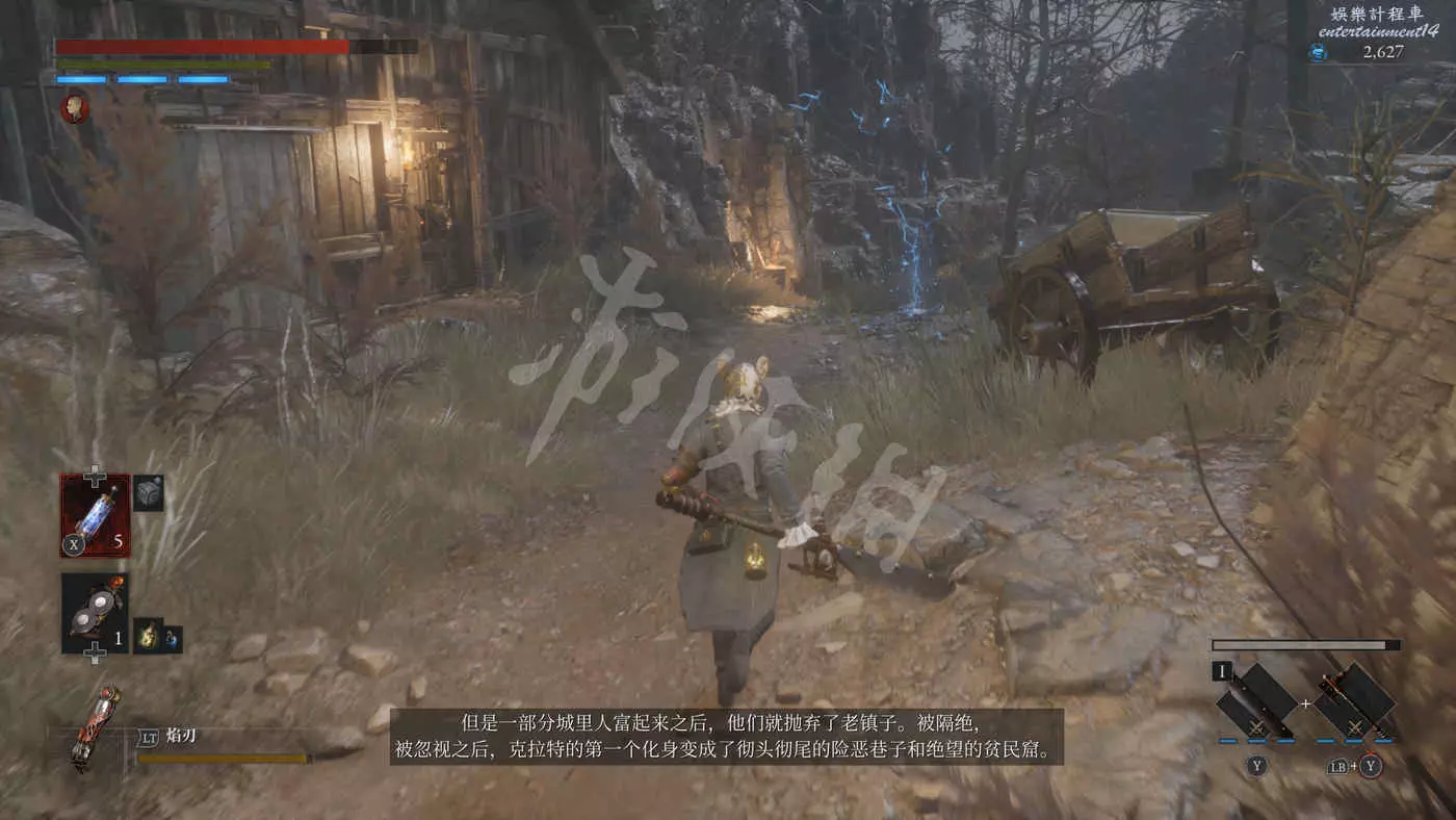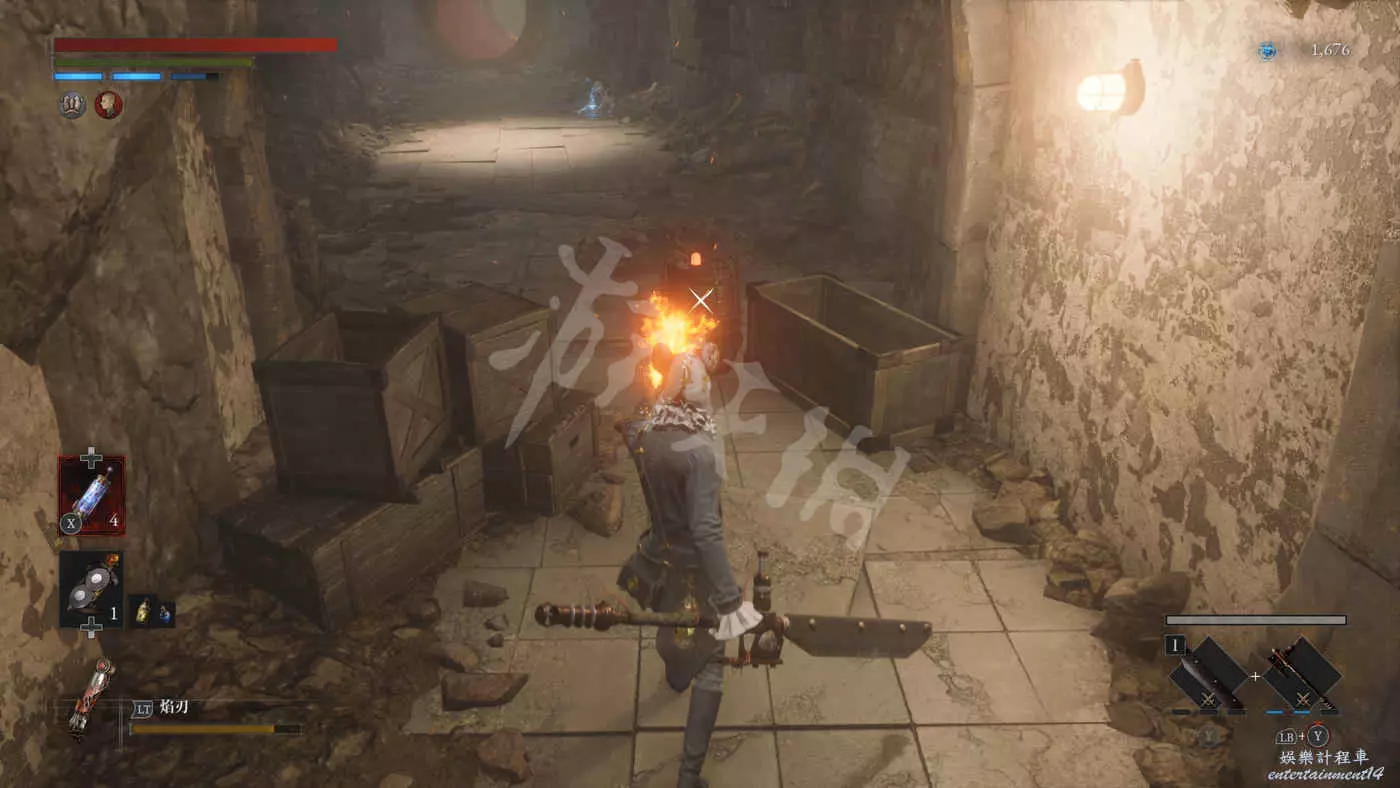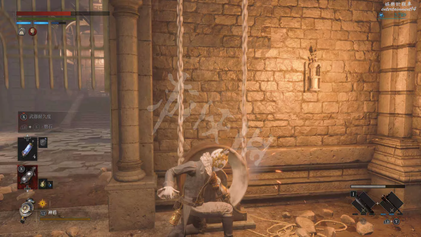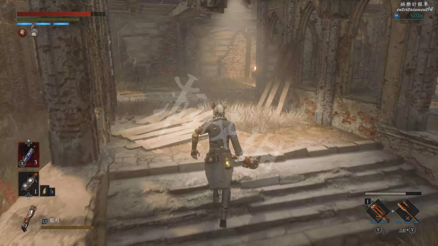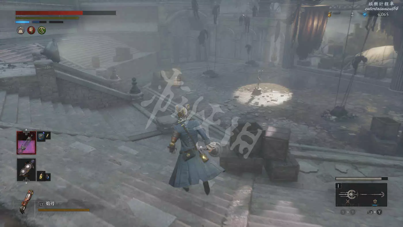 路上來到一個拱門處可以找到一個往上爬的梯子,爬上去之後在盡頭可以看到一個大寶箱,打開後拿到武器【時鐘劍】。