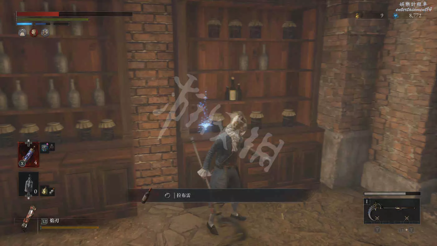 再往下走來到地下二層的酒窖,會遇到一隻雙持釘錘的小丑人偶。擊敗後獲得裝備【獵人護身符】。