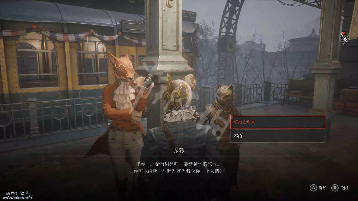 離開擂臺來到纜車月臺又又又又一次見到貓狐二人組,他們會找P要一顆金幣果,選擇【拿出金幣果】。