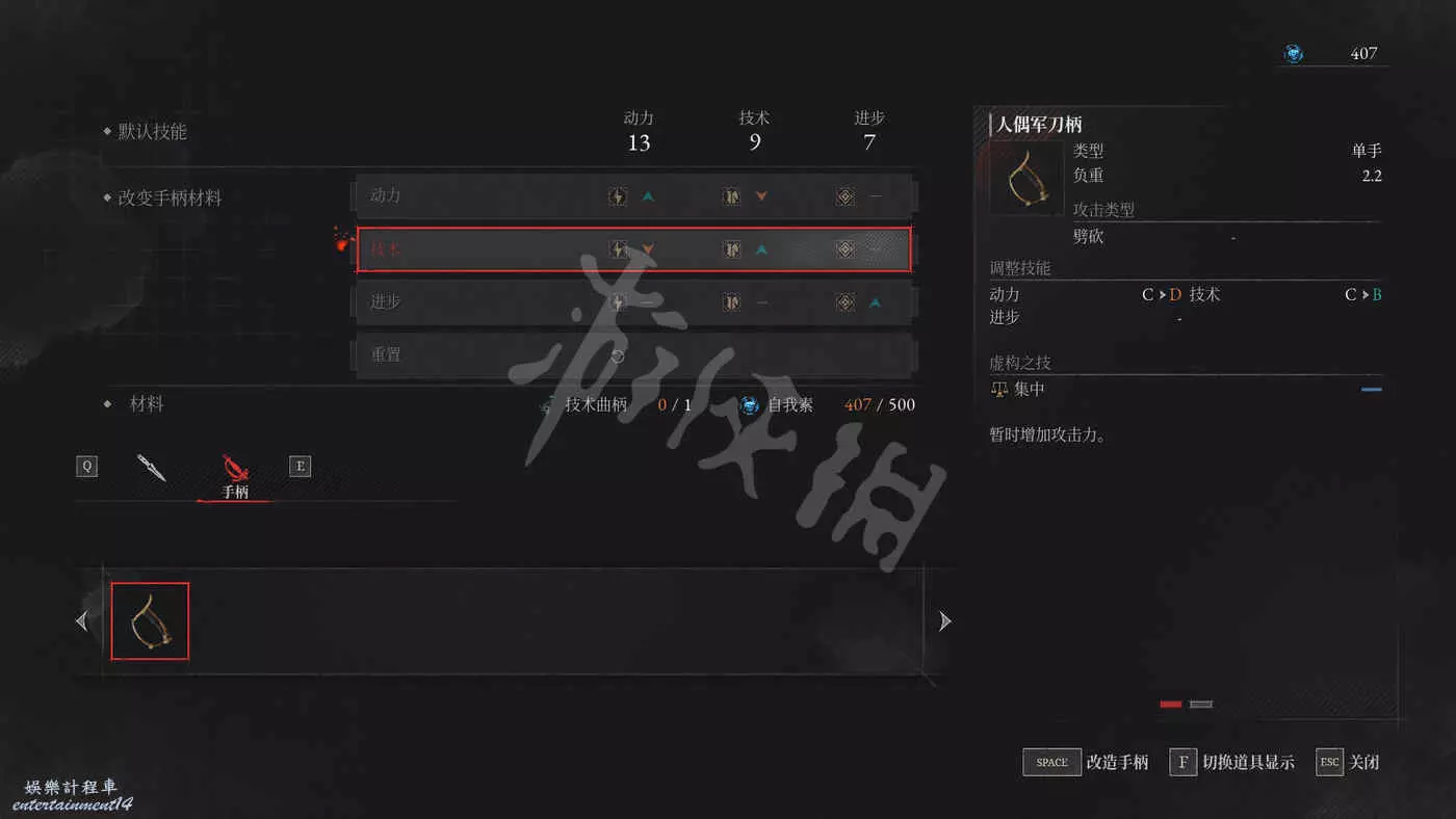 給歐也妮提供曲柄以改造武器手把。手把的屬性升級取決於角色基礎屬性數值。改造手把可改變屬性和等級1次。使用平衡曲柄可重置手把。
