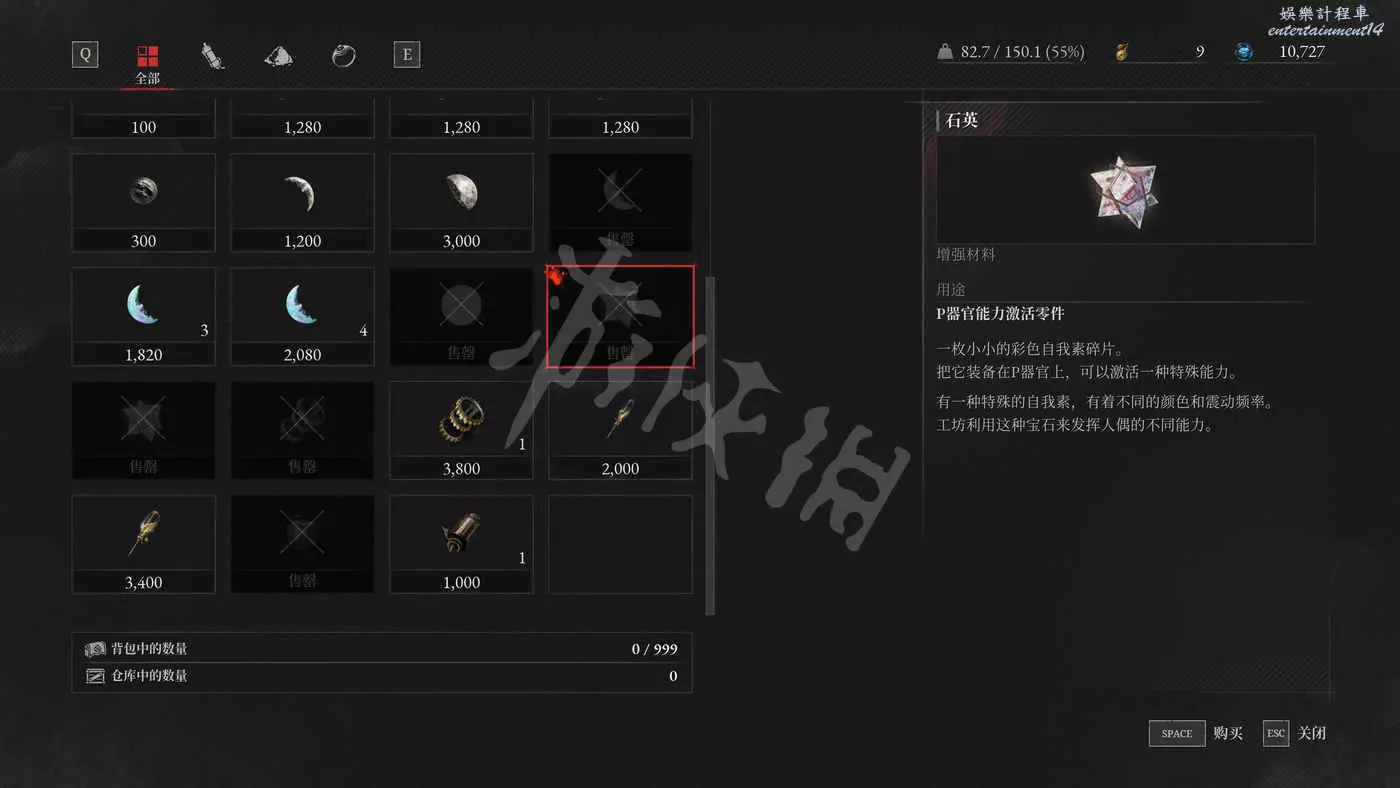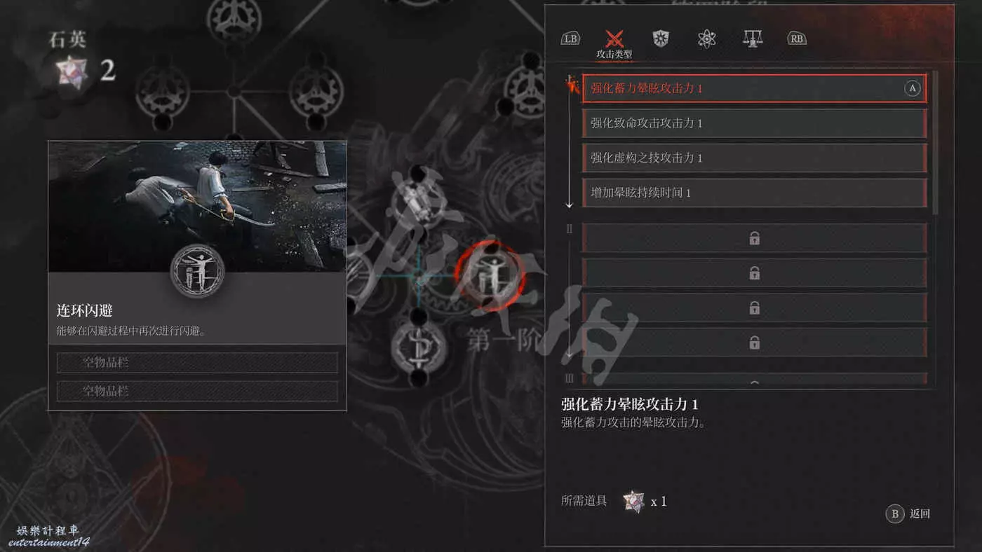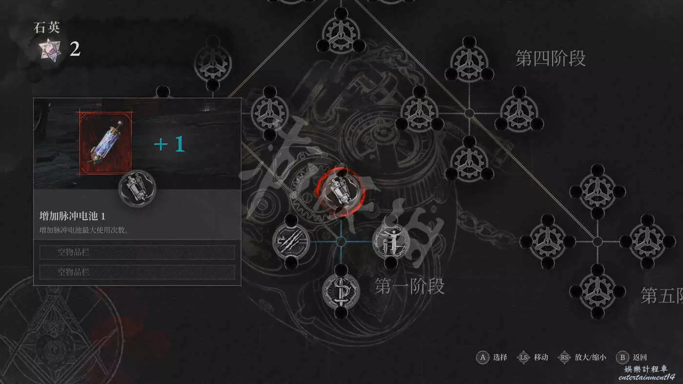 選擇P器官的某個強化效果,然後在插槽中消耗石英來選擇裝備一個次級強化詞條。每個詞條只能裝備一次。
