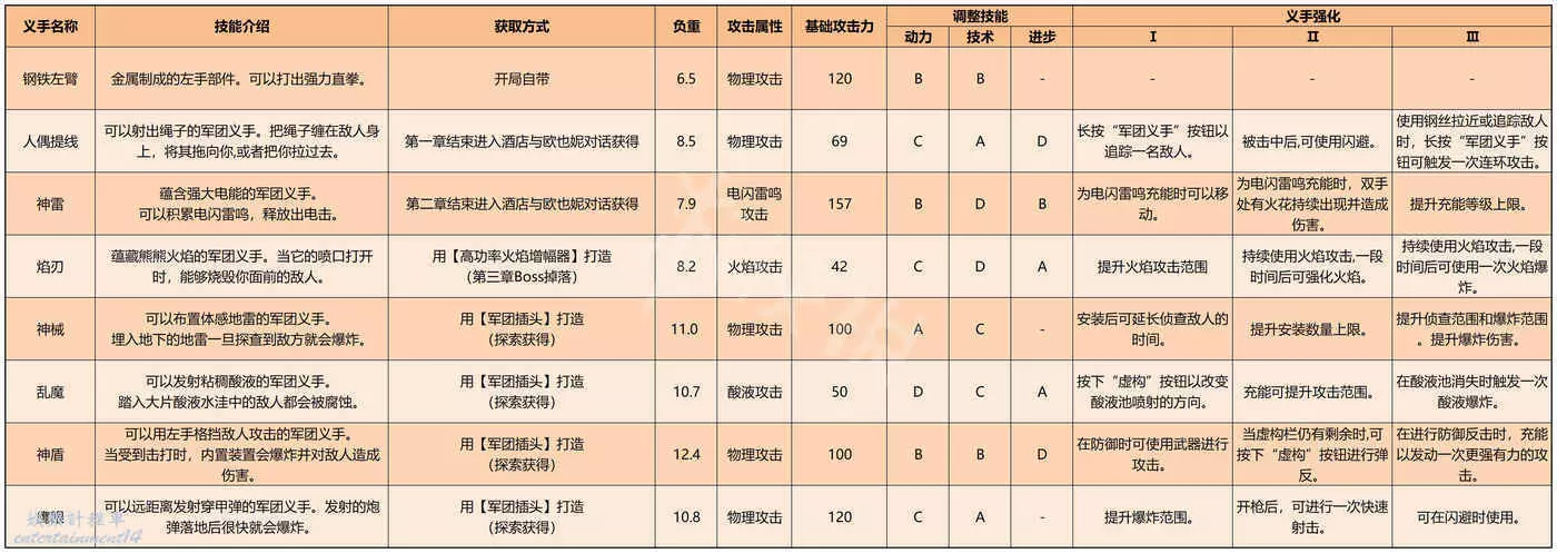 遊戲中所有義手的獲取方式以及技能、屬性等一覽如下。