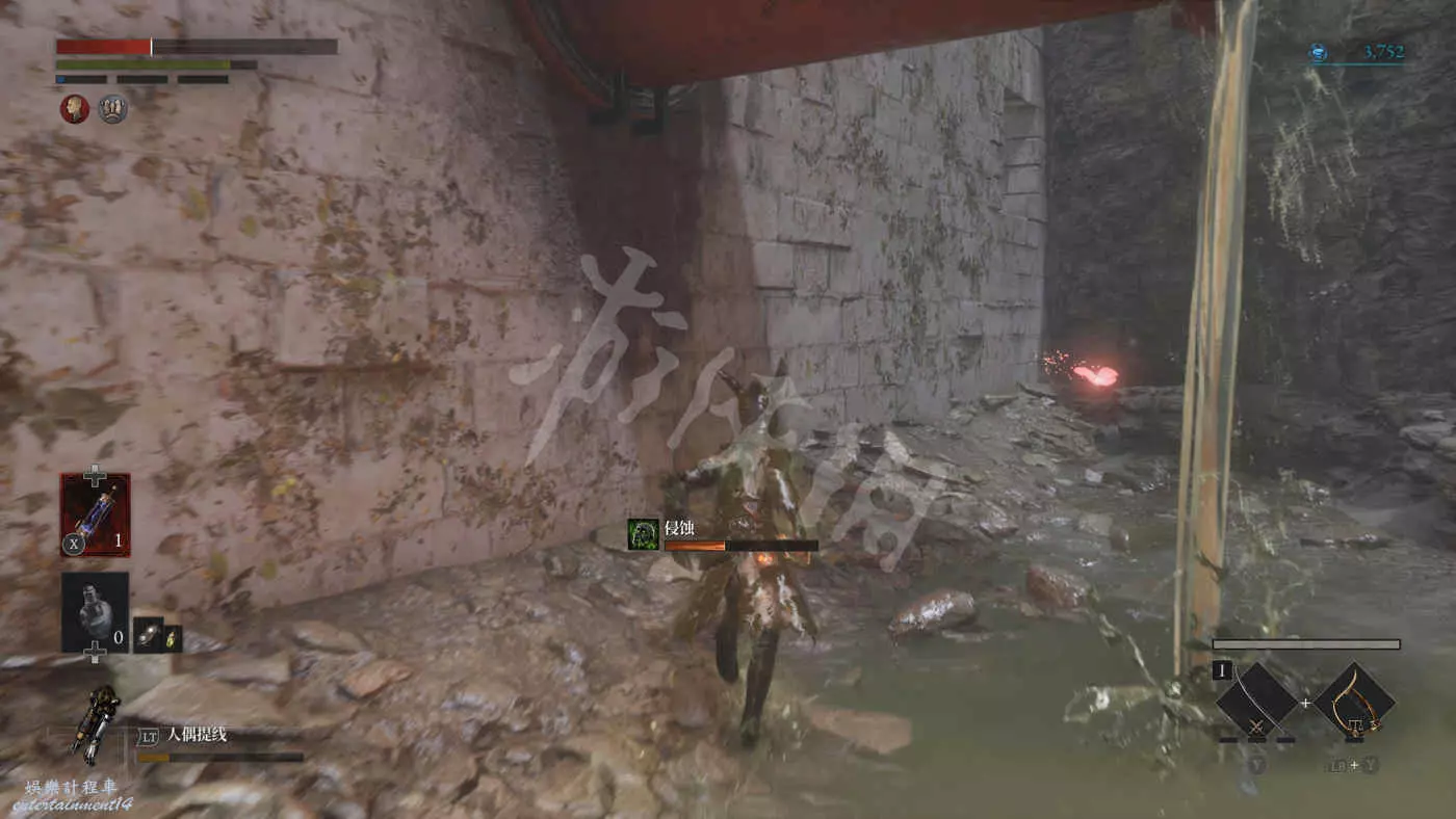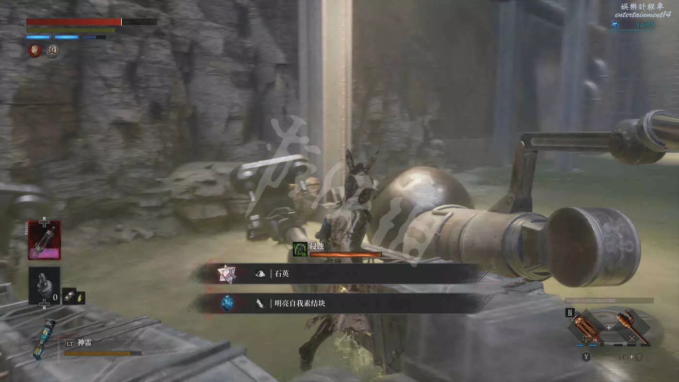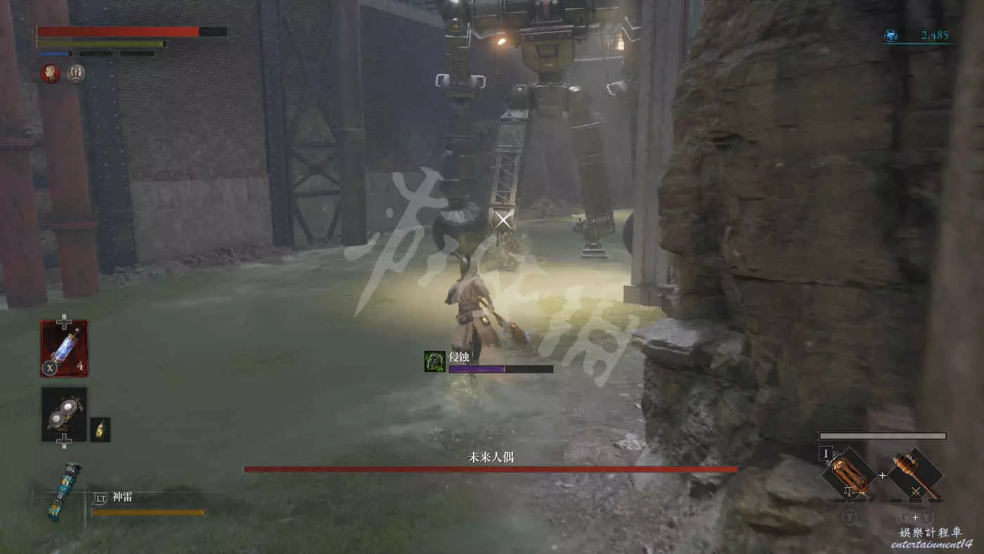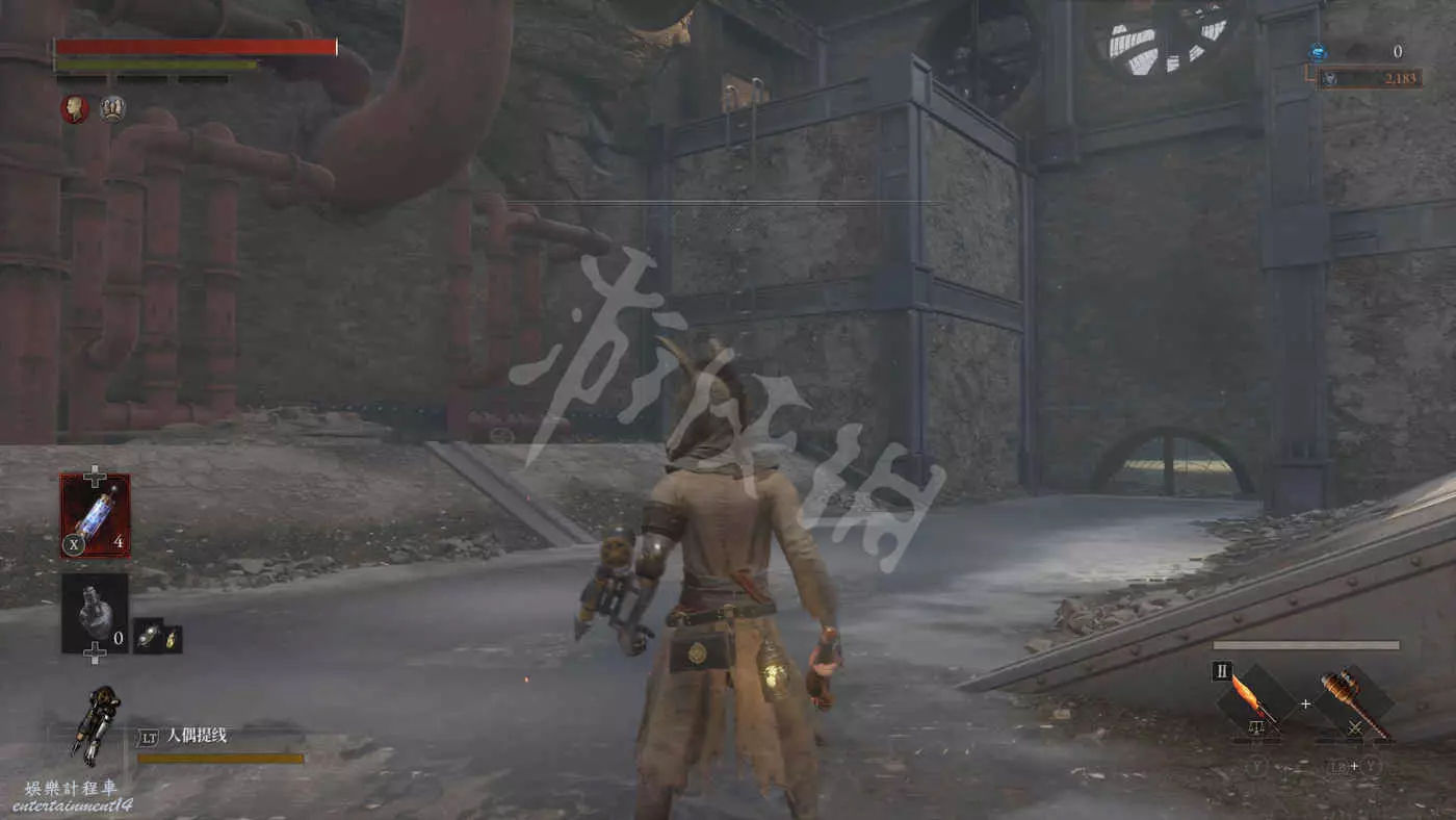 往錨點左側走,走過一個廢棄人偶的過道,爬下梯子來到污水河道(在污水中會持續累積侵蝕效果),會看到一直來回走動的未來人偶,打法比較簡單,一直在腳下蹭到就好,所有招式前搖都很長所以比較容易躲開。擊敗未來人偶後會獲得石英。