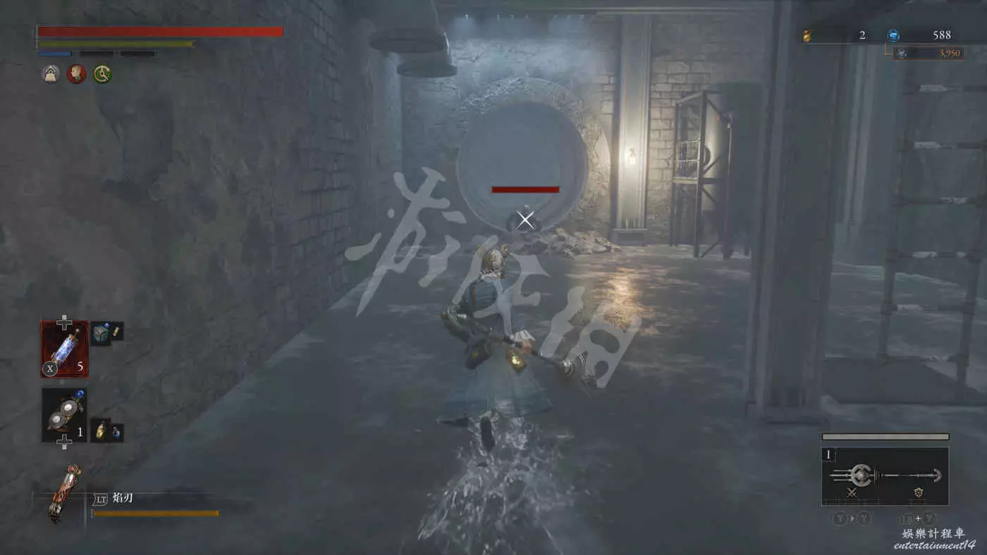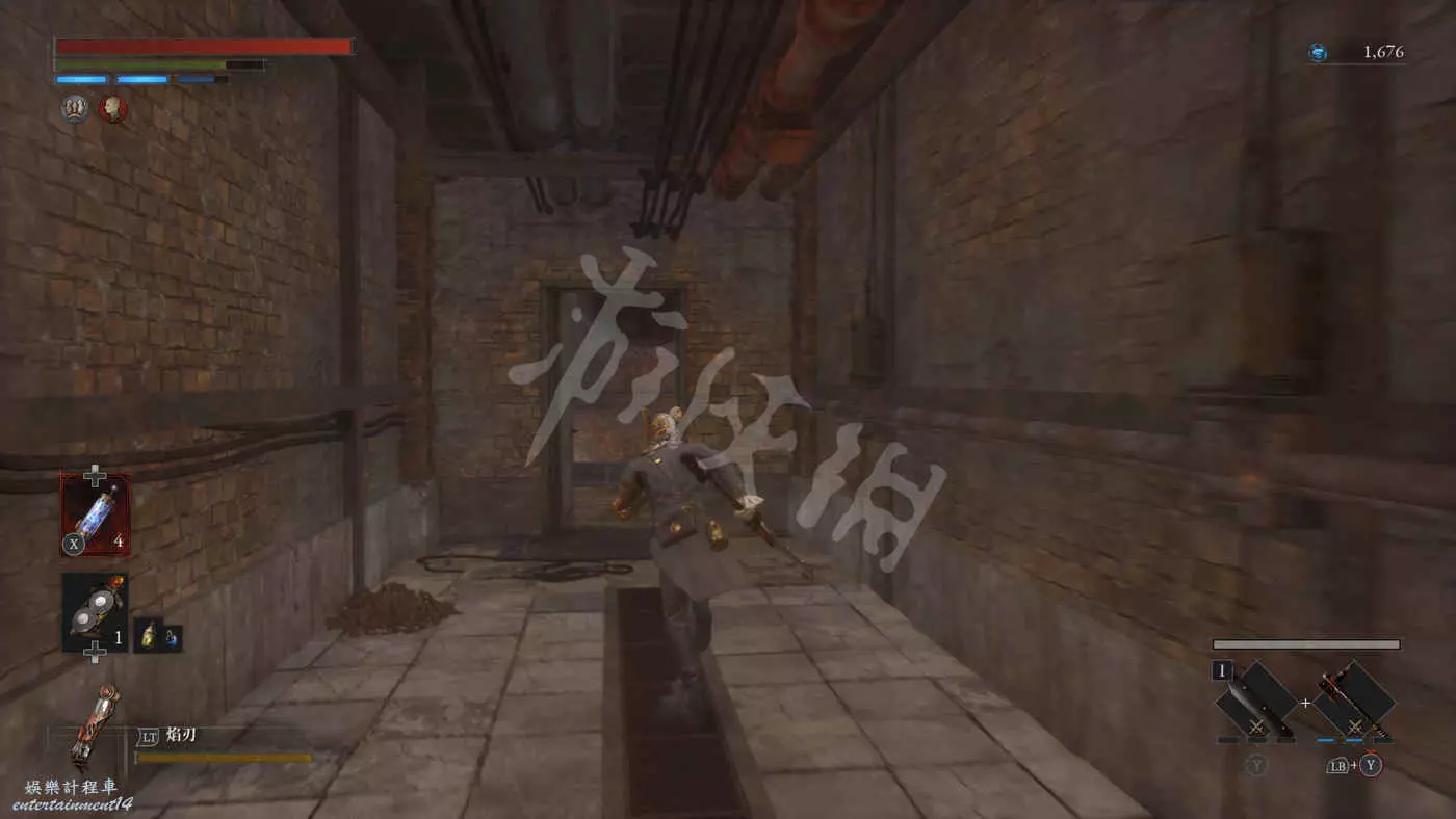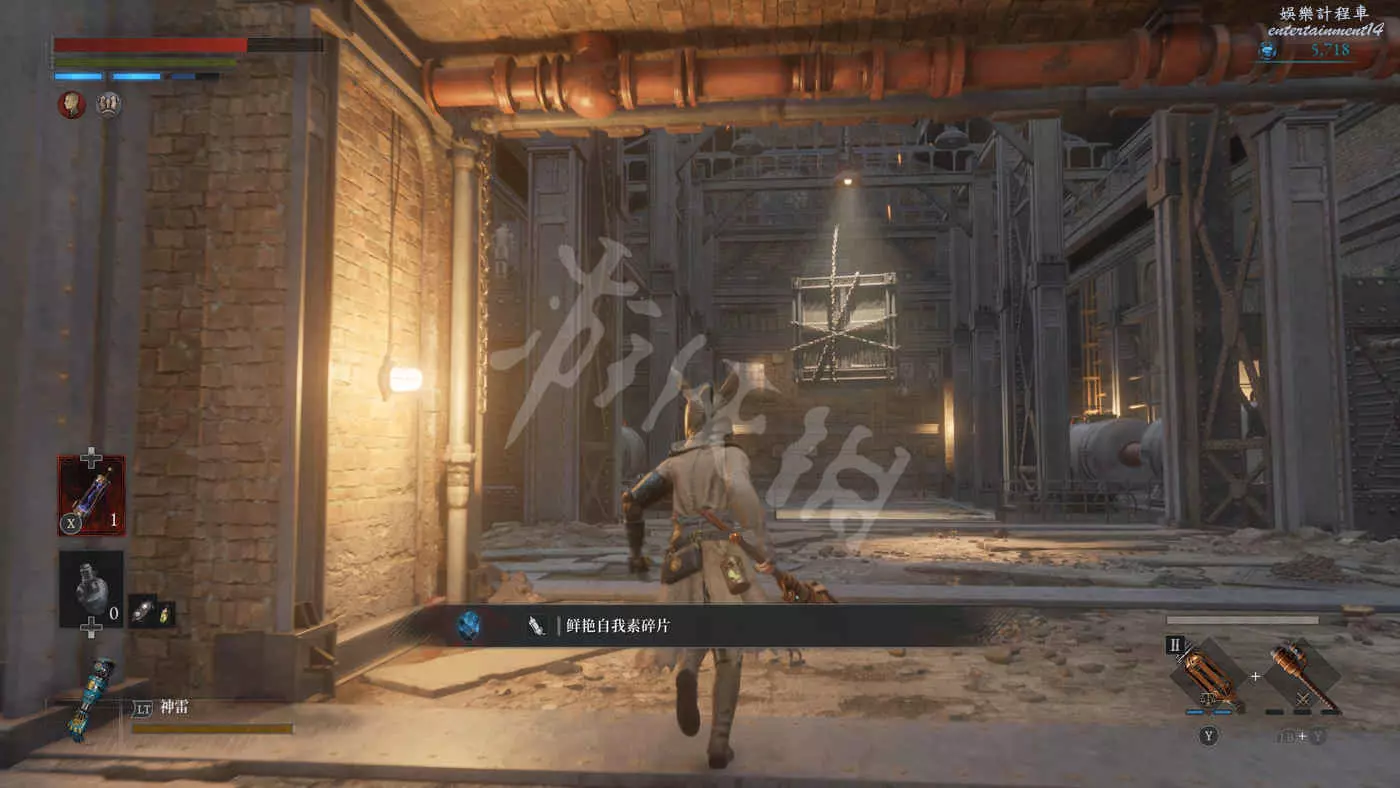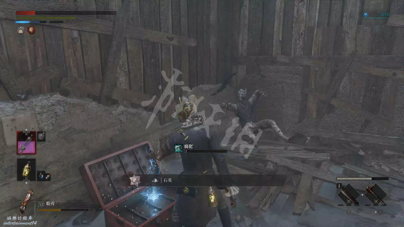 往錨點左側走,走過一個廢棄人偶的過道,爬下梯子來到污水河道(在污水中會持續累積侵蝕效果),會看到一直來回走動的未來人偶,打法比較簡單,一直在腳下蹭到就好,所有招式前搖都很長所以比較容易躲開。擊敗未來人偶後會獲得石英。