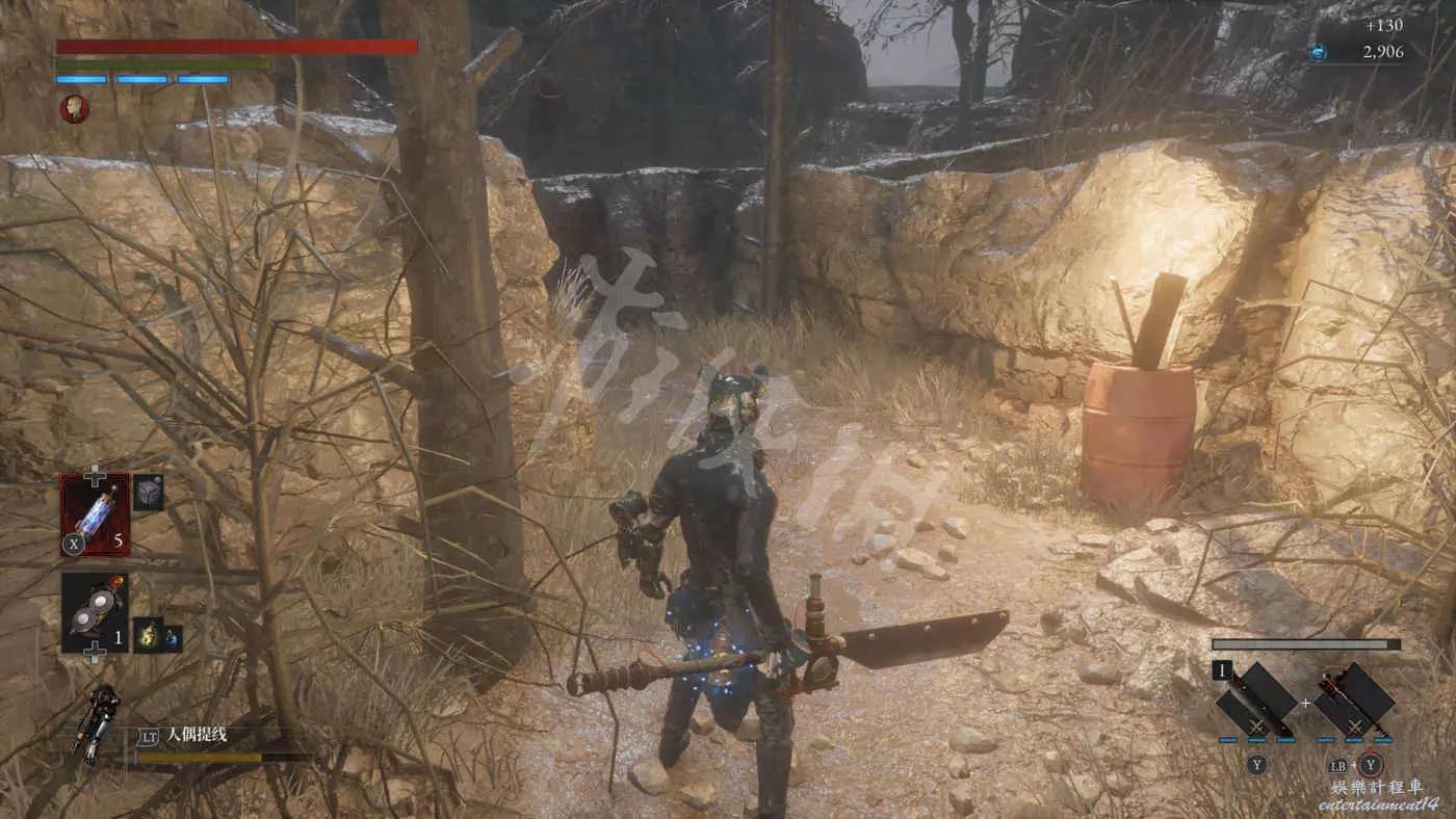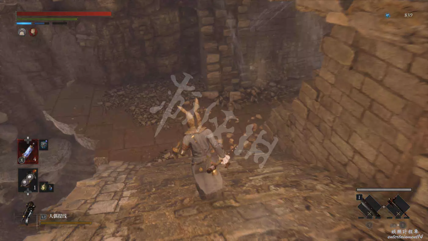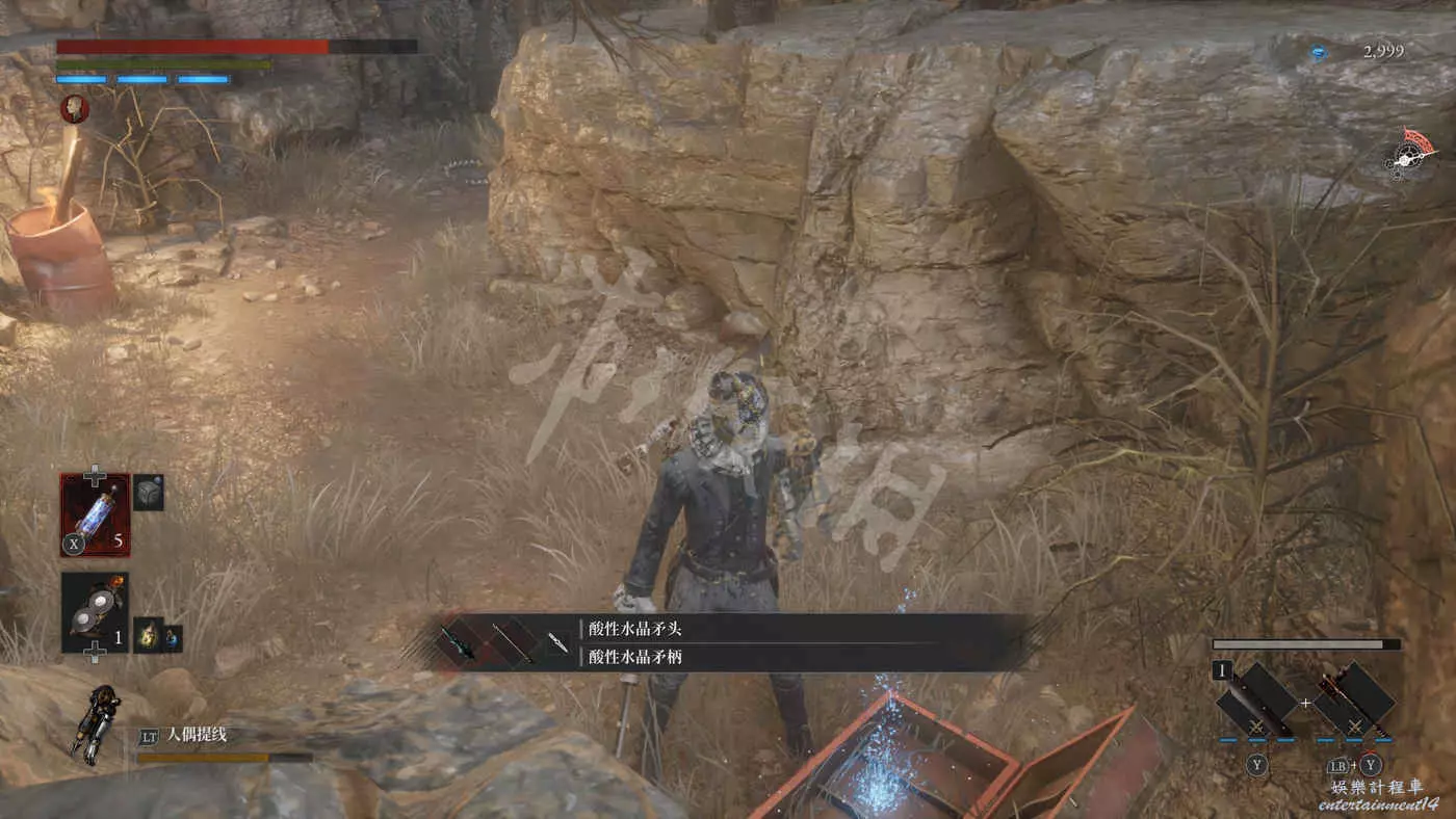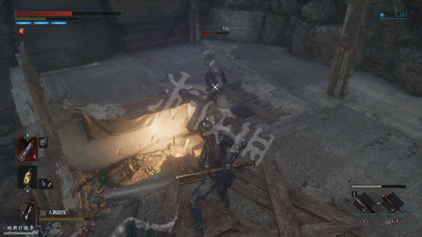 往錨點左側走,走過一個廢棄人偶的過道,爬下梯子來到污水河道(在污水中會持續累積侵蝕效果),會看到一直來回走動的未來人偶,打法比較簡單,一直在腳下蹭到就好,所有招式前搖都很長所以比較容易躲開。擊敗未來人偶後會獲得石英。