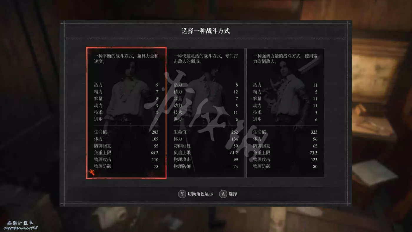 共有三種武器及戰鬥風格可供玩家選擇,具體武器和角色數值如下。