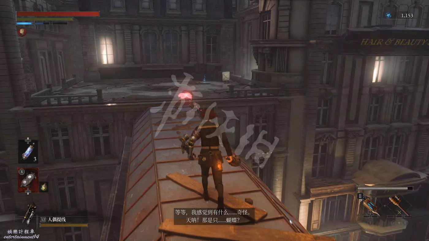 走出房間繼續在屋頂上跑,穿過一個獨木橋時會遇到一隻紅色次元蝶,打掉後能拿到【隱藏月光石】。