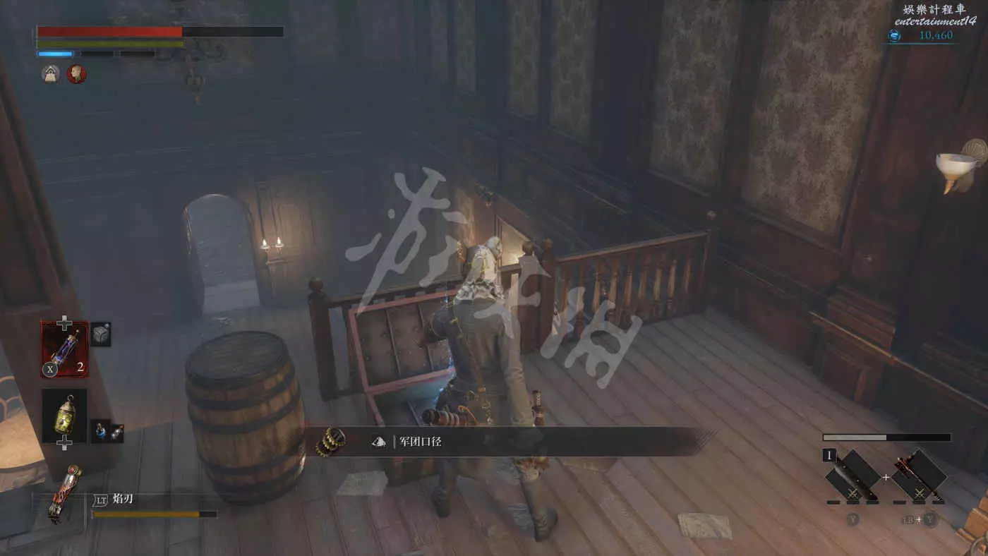 下樓來到士兵人偶展區,在樓梯下的角落有個大寶箱,打開後可以拿到【軍團口徑】。