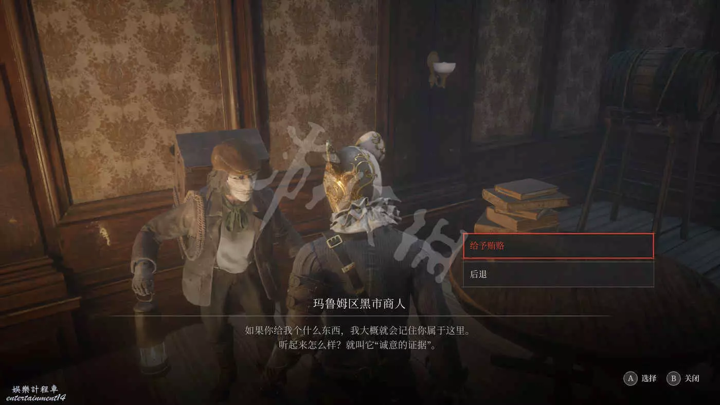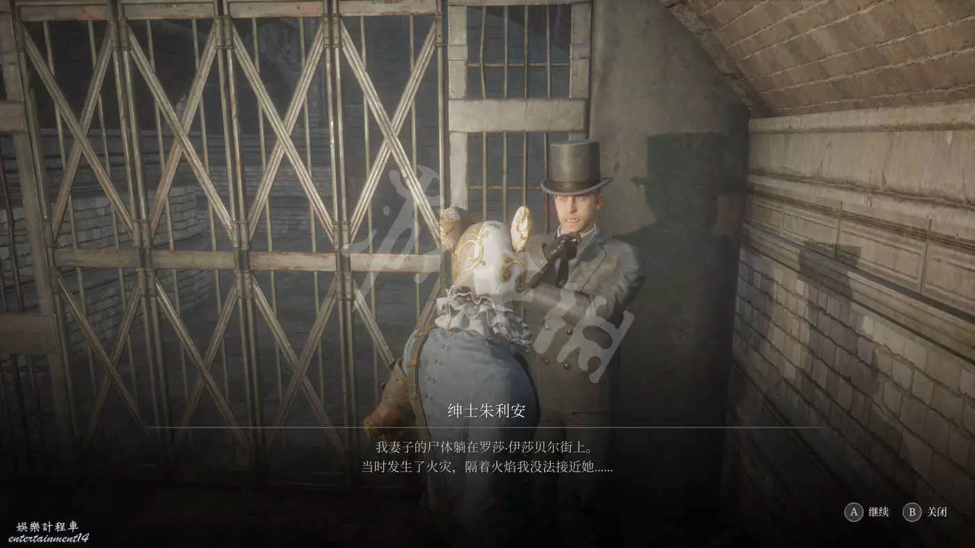 與鐵門旁的西裝男對話,他會委託我們找到他妻子的屍體並取回她的遺物。