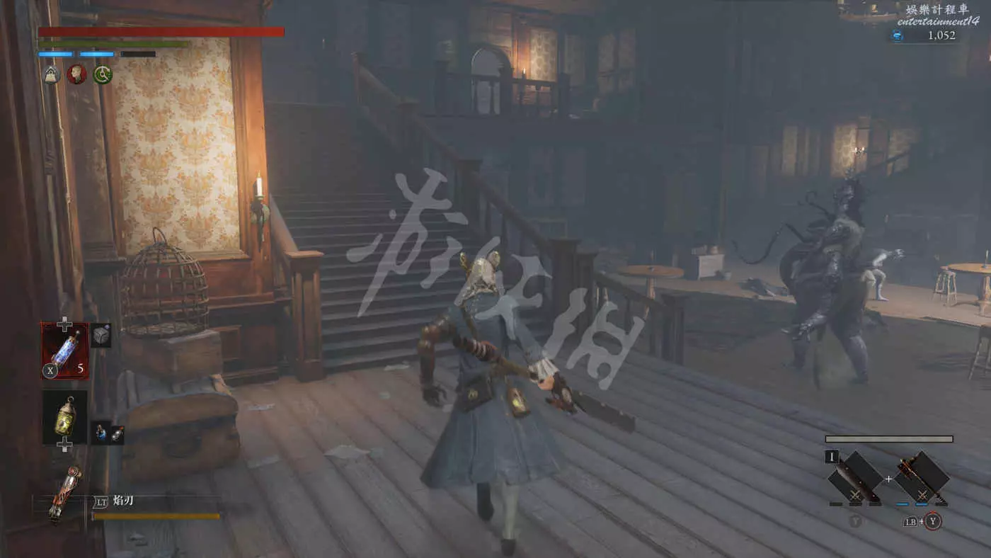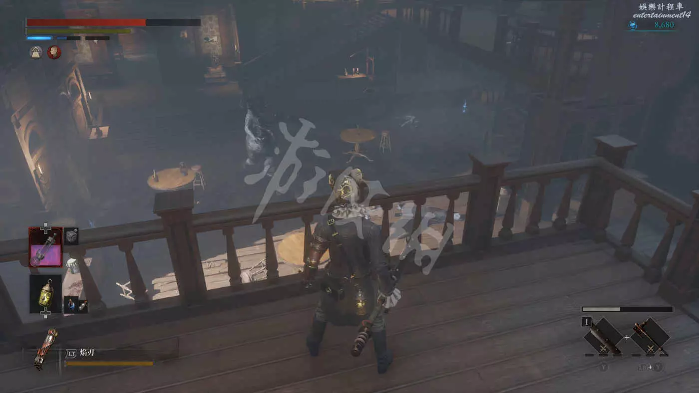 往霧氣較少的通道走過去,往右穿過一個酒吧(左手邊往上有通往拱廊二樓的捷徑)。